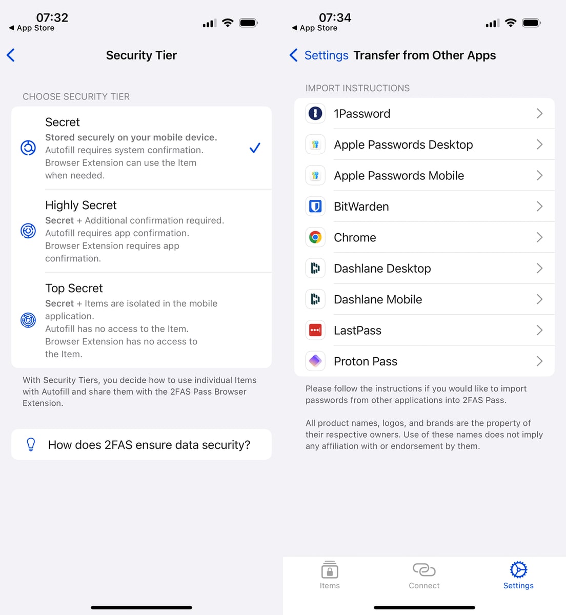 Die Basis-Stufe „Secret“ speichert die Zugangsdaten verschlüsselt auf dem Smartphone. Diese Items lassen sich problemlos mit der Browser-Erweiterung und der Auto-Ausfüllen-Funktion nutzen. Für sensiblere Daten steht die Stufe „Highly Secret“ zur Verfügung. Hier muss jeder Zugriff über die Browser-Erweiterung oder Auto-Ausfüllen zusätzlich in der 2FAS-Pass-App bestätigt werden.