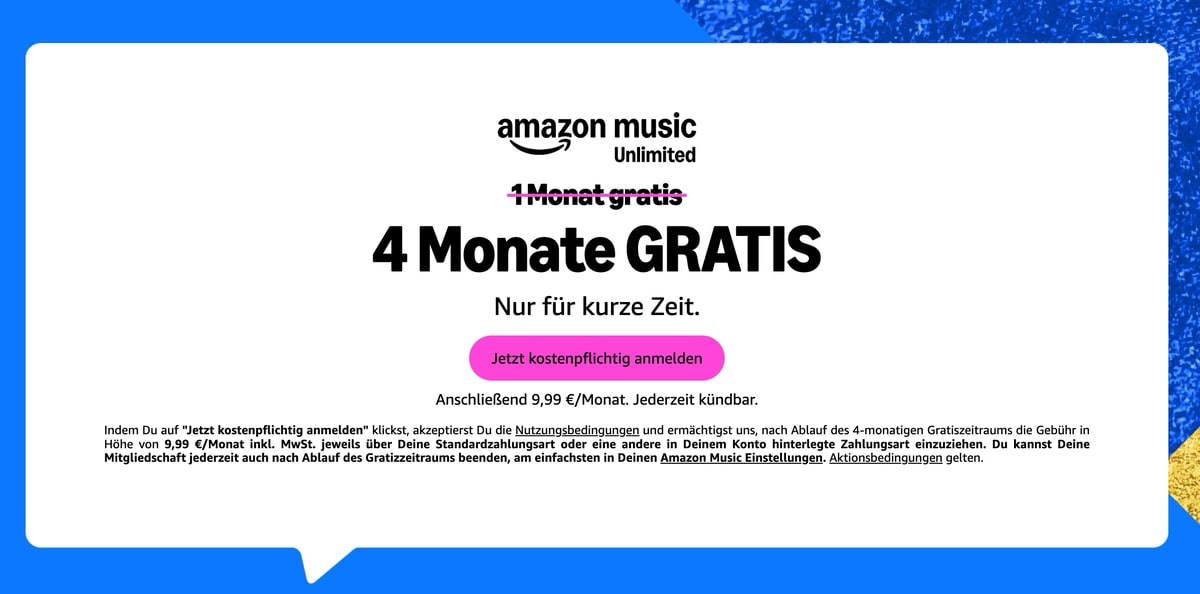(Update: 1.10., Aktion läuft noch) Amazon weitet aktuell seine Werbeoffensive für den hauseigenen Musikstreamingdienst Music Unlimited aus, das liegt daran, dass man auch die kommenden Prime Deal Days flankiert, die am 8. und 9. Oktober stattfinden. Da wird es also auch wieder „Angebote ohne Ende geben“. Interessierte Neukunden können Amazon Music Unlimited jetzt für einen verlängerten Zeitraum kostenlos testen. Dabei zeigt sich Amazon großzügig gegenüber Prime-Abonnenten, die gleich vier Monate ohne Kosten Zugriff auf das komplette Angebot erhalten.