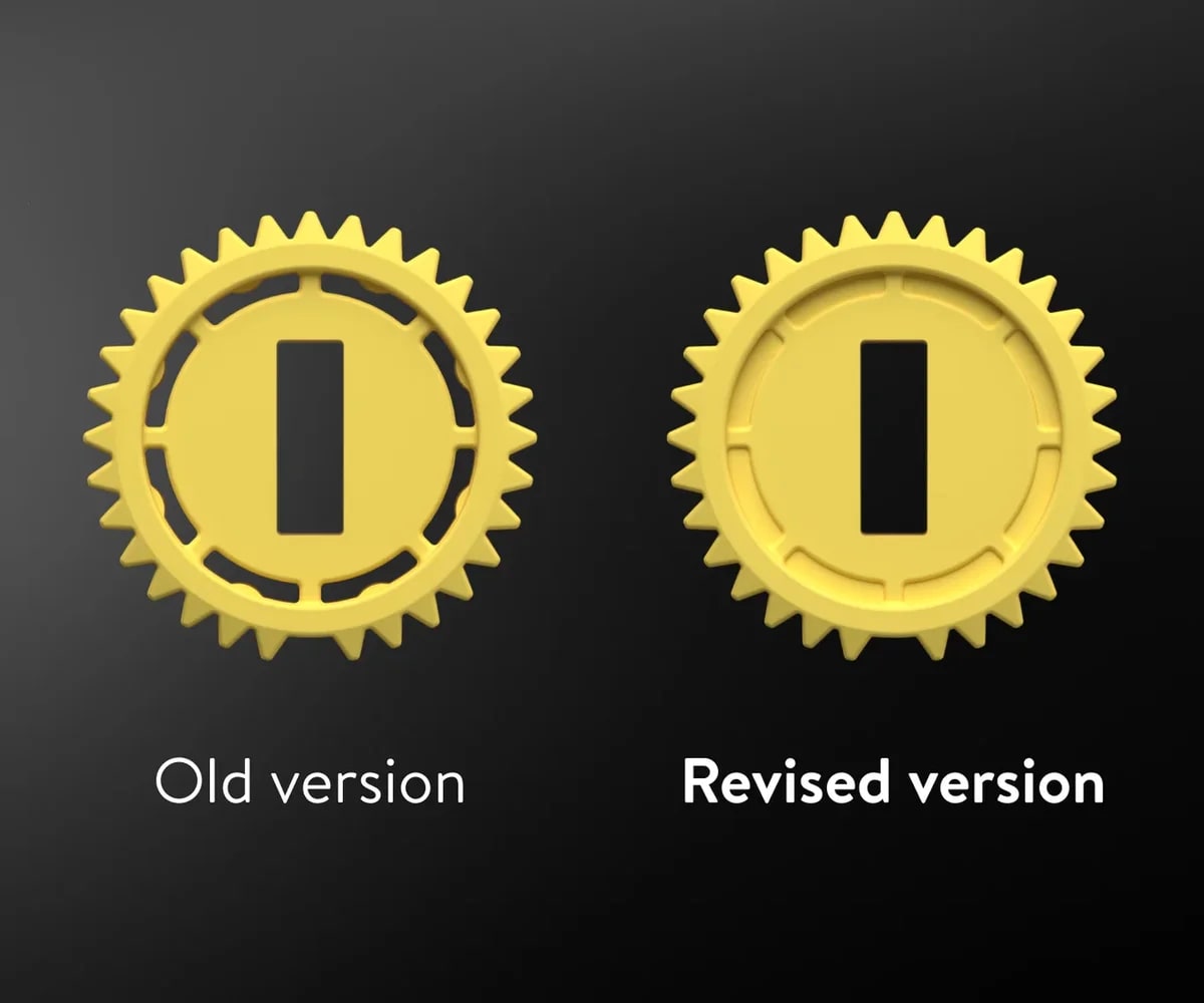 Dann entwirft man ein neues Zahnrad und baut wieder leichte Vertiefungen rein, damit das Teil irgendwann doch defekt geht, man will ja verkaufen! Oder welchen Sinn machen die Kunststoffvertiefungen, wo vorher nur die Stege waren? Warum baut man dies nicht mit Vollmaterial? -achja ist dann das Gewichtsthema oder der Wunsch der Kundschaft 😉