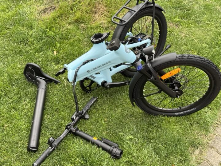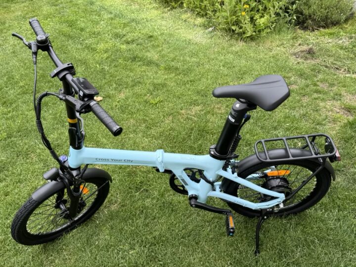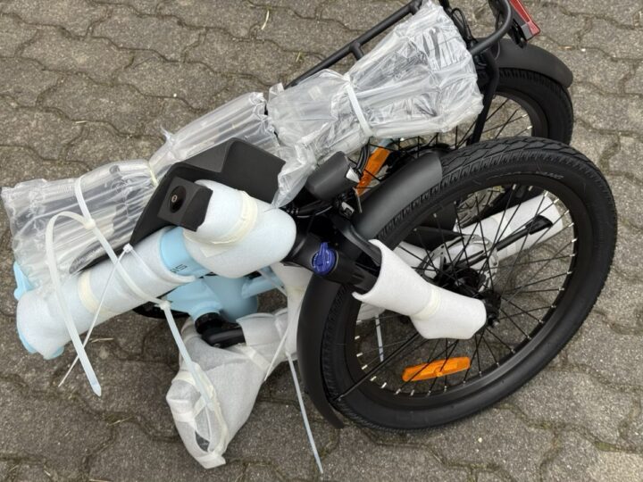 Bleiben wir beim Klappen. Zusammengeklappt (68 x 66 cm) verschwindet das Rad problemlos im Kofferraum oder in der Bahn und auch im Alltag lässt es sich dank 18 kg Gewicht noch gut herumtragen. Beim Fahren merkt man diesen Kompromiss aber nicht. Der kleine Rahmen fühlt sich stabil an, nichts klappert oder wackelt. Das ist vor allem bei schnellen Stadtfahrten, Kurven oder Unebenheiten spürbar.
