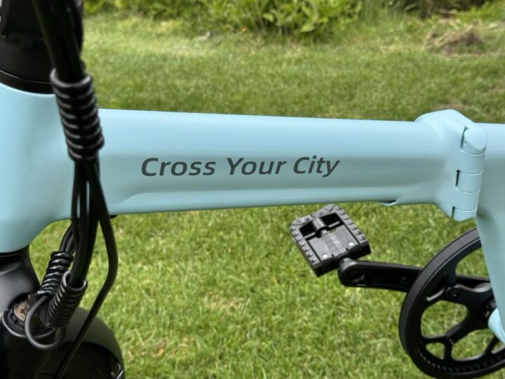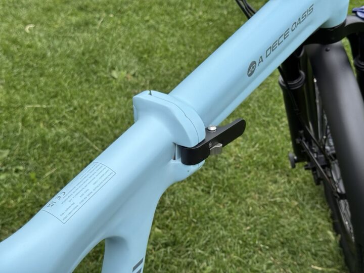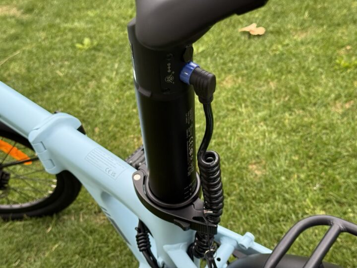 Die Linienführung ist sportlich und etwas kantig, wobei das Rahmendesign wertig und modern wirkt. Wer schon mal ein Klappfahrrad gesehen hat oder gefahren ist, wird mir eventuell zustimmen, dass das schon gefällig aussieht. Der 345-Wh-Akku ist in der Sattelstütze versteckt, daher ist die auch so ein fett. Das macht die Konturen zwar etwas massiver, sorgt aber für ein angenehmes Plus an Alltagstauglichkeit. Man hat also keine extra Klappe im Rahmen oder sonst wo. Schnellspanner und Zusatzschloss werden mitgeliefert, Akku im Handumdrehen raus oder wieder drin, dazu eine einfache Sicherung gegen Diebstahl. Das alles ist sehr angenehm gelöst.