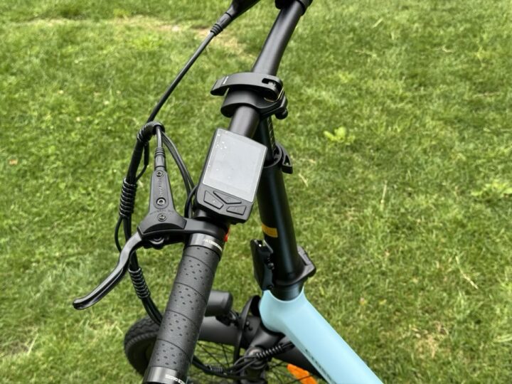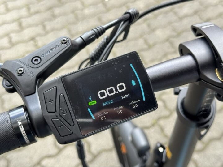 Die Lenkstange bietet viel Spielraum in der Höhe. Ich kann das Rad locker auf meine Größe (1,83 m) anpassen. Da ist auch noch Luft nach oben. Klar – bei großen Personen sieht das kleine Rad schon witzig aus, aber die Teile sind ja dafür gedacht, dass man sie mal schnell ins Auto, den Camper oder wo auch immer hinpackt und dann damit durch die Gegend gondelt. Was gibt’s noch? Wertige Griffe, ein gut platziertes Farbdisplay und ein extrem stabiler Schnellspann-Mechanismus am Faltgelenk. Gerade letztgenannte sind bei einem Faltrad extrem wichtig. Man will schließlich nicht, dass das Rad während des Fahrens im wahrsten Sinne des Wortes die Biege macht.