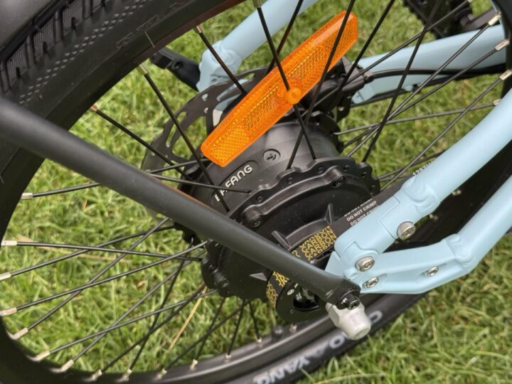 Kommen wir zum Motor: Beim Air 20 Pro arbeitet hinten ein leiser, kräftiger Bafang-Heckmotor mit 250 W und 40 Nm Drehmoment. Im Motorgehäuse sitzt nun eine automatische 2-Gang-Schaltbox. Was das heißt? Das Rad sieht wie ein Single-Speed aus, aber bei rund 20 km/h schaltet intern der zweite Gang rein und die Übersetzung wird länger. Das fühlt sich beim Fahren sehr direkt an. Die Trittfrequenz sinkt dadurch bei höheren Geschwindigkeiten deutlich.