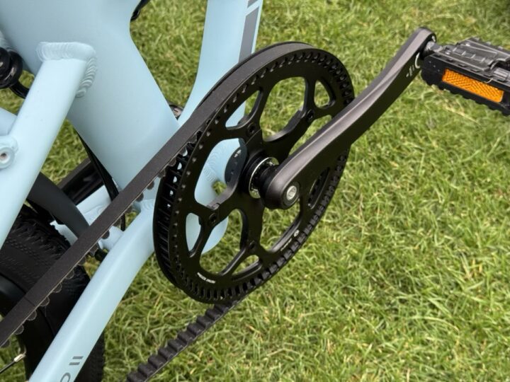 Das Air 20 Pro hat genau wie sein großes Geschwistermodell einen Carbonriemen und keine Kette. Dadurch braucht ihr kein Fett, müsst nicht schmieren und habt demzufolge keine dreckigen Hosenbeine. Da es ein Klapprad ist, ist der Vorteil noch größer. Man kann das Rad mehrfach am Tag falten, tragen, wieder auseinanderklappen, ohne sich immer vollzusauen. Dazu kommt, dass das Teil nahezu wartungsfrei ist. Der Hersteller spricht von 20.000 bis 30.000 km Laufleistung. Reicht also ein paar Jahre.