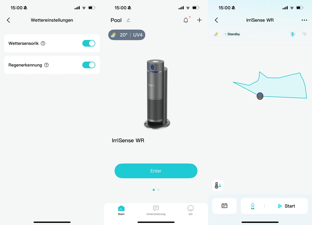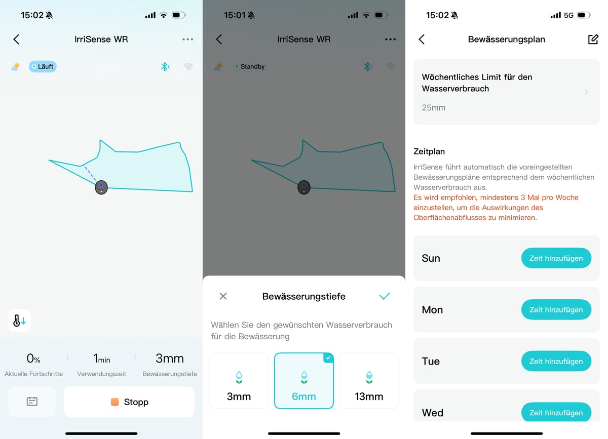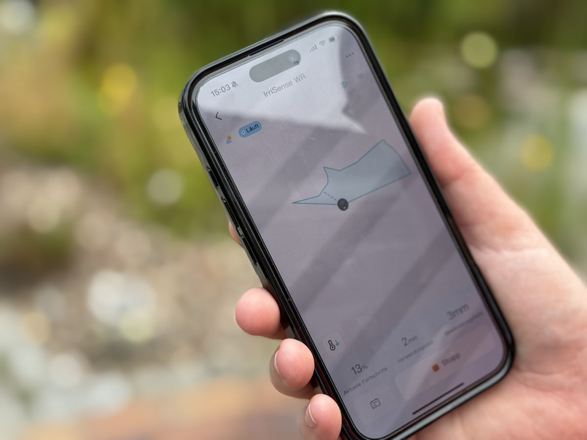Ist die Kartierung abgeschlossen, erstellt die App einen Bewässerungsplan. Der IrriSense bewässert dann automatisch von außen nach innen, zunächst die Randbereiche, dann die innenliegenden Flächen. Ein integrierter Regensensor unterbricht die Bewässerung bei Niederschlag nach 5 Minuten. Das klappt auch alles sehr gut, da habe ich absolut nichts zu meckern.