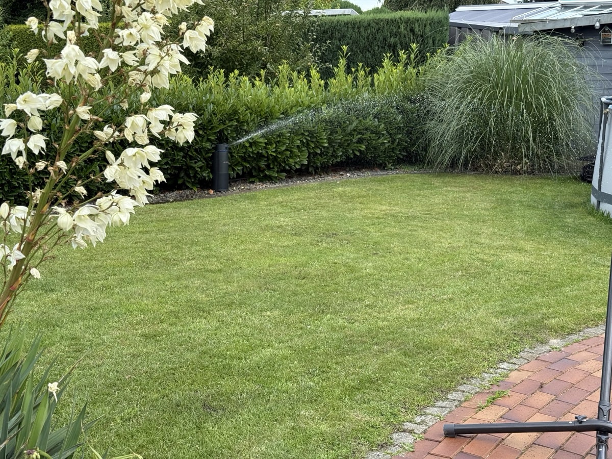 Meistens baut man allerdings Versenksprenger ein. Ich habe dies zunächst mit Gardena getan, weil geläufig. Die waren aber zu oft defekt, sodass ich zwar das ganze Gardena Schauchzeugs vergraben habe, aber die Sprenger von Hunter im Einsatz habe. Das funktioniert prima und kostet pro Sprenger rund 20 Euro. Wer einen viereckigen Garten hat, braucht halt 4 Stück. Bei uns auf dem recht großen Grundstück sind 9 im Einsatz, die über einen Bewässerungscomputer (OpenSprinkler) und eine Ventilbox mit Wasser versorgt werden. Ventilbox, um verschiedene Bewässerungskreise anzusteuern, weil sonst der Wasserdruck nicht ausreicht.
