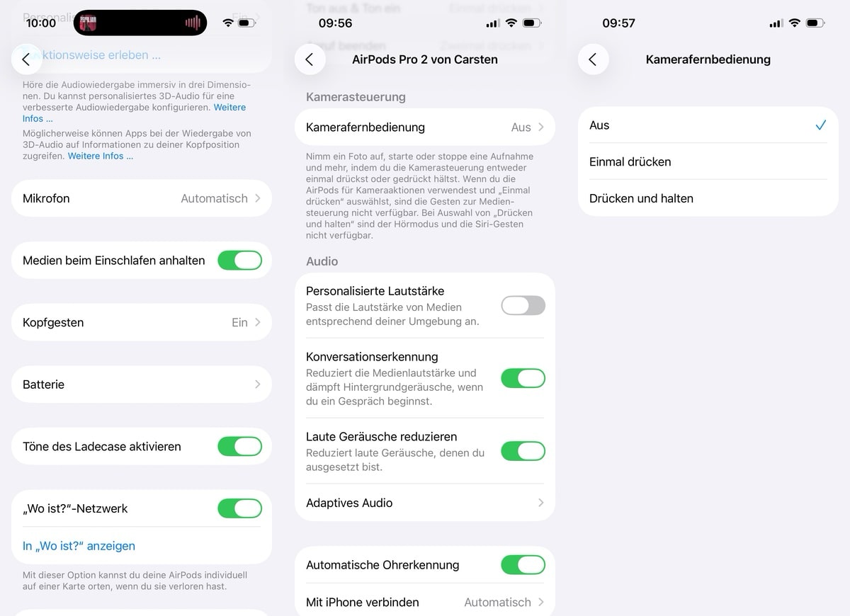 Die Einrichtung geht schnell von der Hand. In den Einstellungen unter dem Namen der AirPods findet sich die neue Option „Kamerafernbedienung“. Hier lässt sich festlegen, ob ein einfacher Druck oder langes Drücken den Auslöser aktiviert. Bei der ersten Option steht temporär keine Mediensteuerung zur Verfügung, bei der zweiten werden kurzzeitig die Hörmodi und Siri-Gesten deaktiviert. Wichtig zu wissen: Das bezieht sich nicht auf die generelle Steuerung, sondern lediglich, wenn eine entsprechende Kamera-App geöffnet ist!