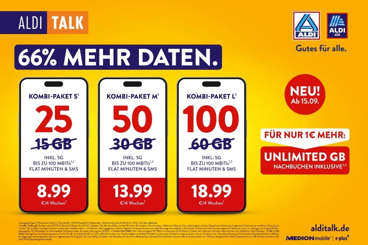 ALDI legt bei seinen Mobilfunktarifen einen Zahn zu. Ab dem heutigen 15. September gibts bei ALDI TALK mehr Datenvolumen. Alle Tarife werden mit 66 Prozent mehr Datenvolumen ausgestattet, während die Preise stabil bleiben. Im Kombi-Paket S werden künftig statt 15 GB satte 25 GB für 8,99 Euro alle vier Wochen bereitgestellt. Das M-Paket macht einen Sprung von 30 auf 50 GB zum Preis von 13,99 Euro. Wer mehr will, greift zum L-Paket mit jetzt 100 GB statt bisher 60 GB für 18,99 Euro.