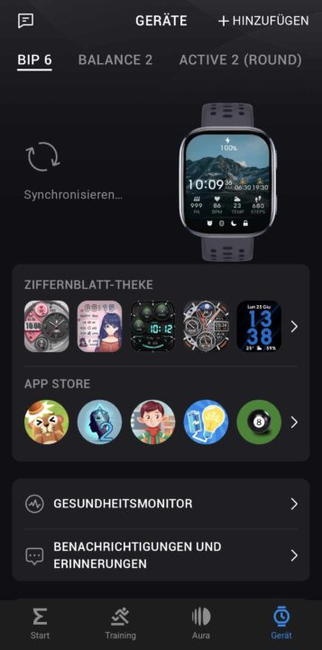 Mit gemischten Krafttrainings können weder der Bip 6 noch die anderen Wearables von Amazfit aber viel anfangen. Wer also, wie ich, im Fitnessstudio an dem Tracker ein Krafttraining beginnt und dann verschiedene Geräte durchgeht, hat am Ende in der Regel einen einzigen Satz mit unzähligen Wiederholungen stehen. Klappt aber an anderen Geräten des Herstellers auch nicht besser. Auf Wunsch könnt ihr mit dem Tracker im Übrigen auch direkt per Bluetooth andere Devices verbinden. Eigenen Musikspeicher bringt das Gerät aber nicht mit.