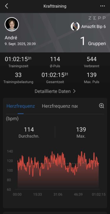 Der Amazfit Bip 6 verfügt über eigene Standorterkennung, die auch wirklich schnell und zuverlässig funktioniert. Das ist aber aus meiner Sicht seit jeher eine Stärke der Wearables von Amazfit. Auch der Pulsmesser arbeitet nach meinem Eindruck zuverlässig und hat zum Beispiel beim Laufen anstrengendere und lockere Phasen gut erkannt. In der Zepp-App findet ihr dann nach der Synchronisierung der jeweiligen Workouts viele zusätzliche Informationen.
