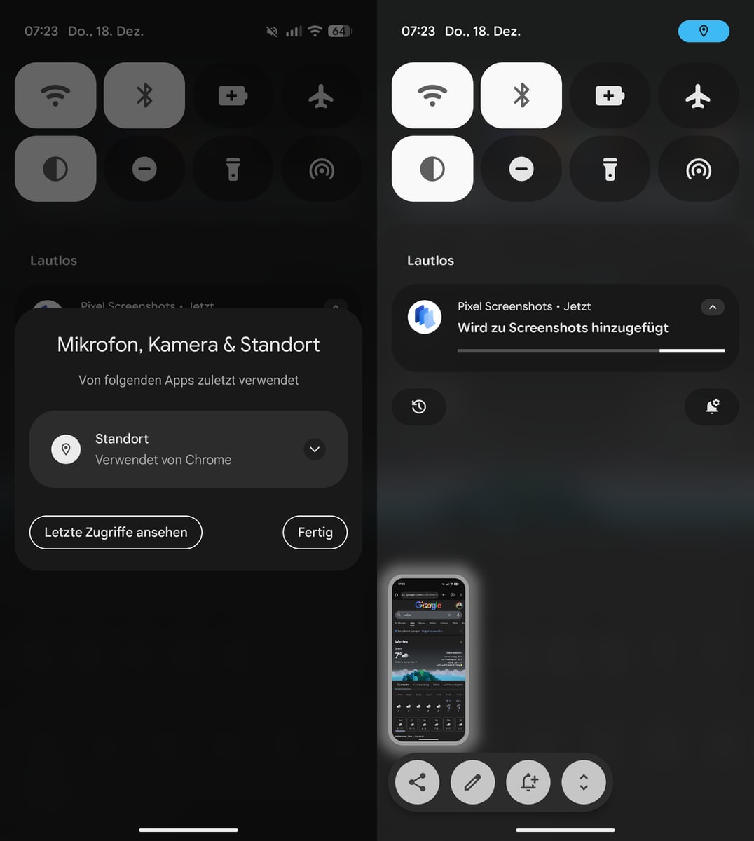Das System unterscheidet dabei nicht, ob der Zugriff im Vordergrund oder im Hintergrund passiert. Sollten Kamera, Mikrofon und Standort gleichzeitig genutzt werden, tauchen nicht mehrere Punkte nebeneinander auf, stattdessen fasst Android die Indikatoren zusammen.
