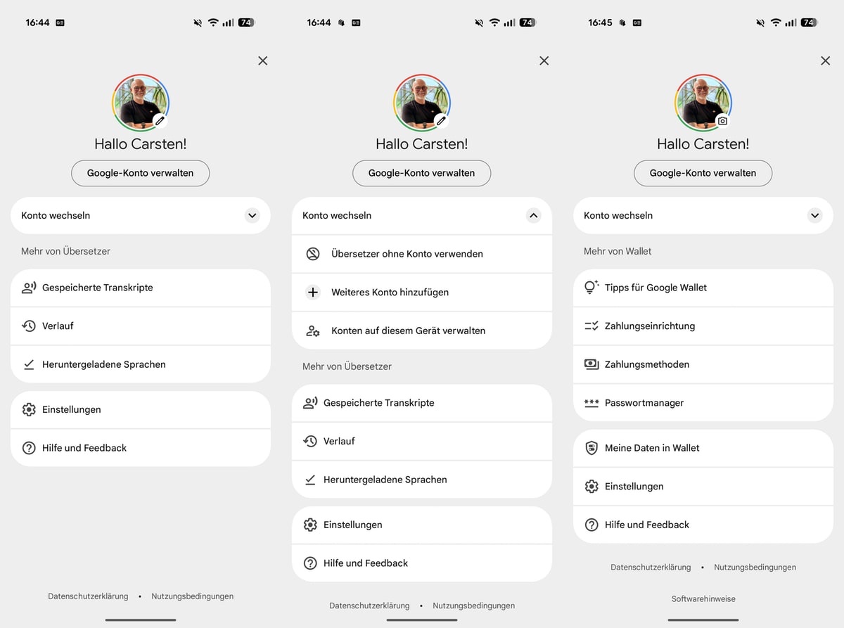 Die Neuerung vereinfacht den Wechsel zwischen verschiedenen Google-Konten. Bisher war der Prozess umständlicher und erforderte mehrere Klicks über den Umweg der Kontoeinstellungen. Mit dem Update präsentiert sich der Account-Switcher aufgeräumter: Das Profilbild des Hauptkontos erscheint oben, darunter findet sich die Option „Google-Konto verwalten“. Neu ist das ausklappbare „Konto wechseln“-Menü, das direkten Zugriff auf weitere verbundene Konten bietet. Auch die Optionen „Weiteres Konto hinzufügen“ und „Konten auf diesem Gerät verwalten“ sind dort integriert.