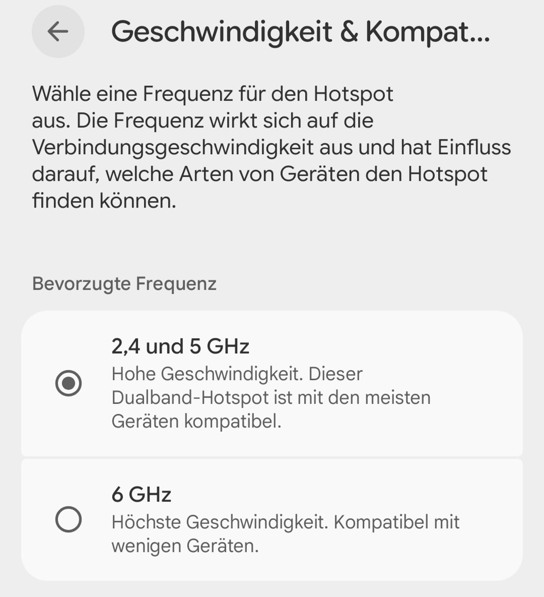 Wer unterwegs das Smartphone als mobilen Router einsetzt, kennt die Problematik vielleicht. Standardmäßig spannen Android-Geräte ein Netzwerk auf, das die Frequenzen 2,4 und 5 GHz nutzt. Das gewährleistet, dass sich so gut wie jedes Endgerät verbinden kann. Mit neuerer Hardware, die Wi-Fi 6E oder Wi-Fi 7 unterstützt, steht theoretisch auch das 6-GHz-Band zur Verfügung. Das bietet zwar einen höheren Durchsatz, hat aber physikalisch bedingt eine geringere Reichweite und wird von älterer Hardware schlicht nicht gesehen. Google arbeitet derzeit an einer Lösung, die beide Welten vereinen soll.
