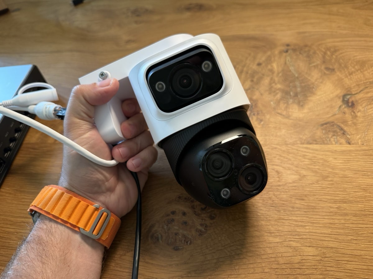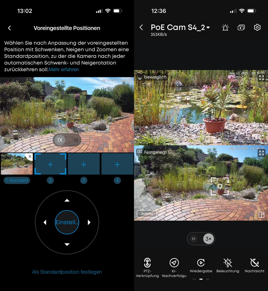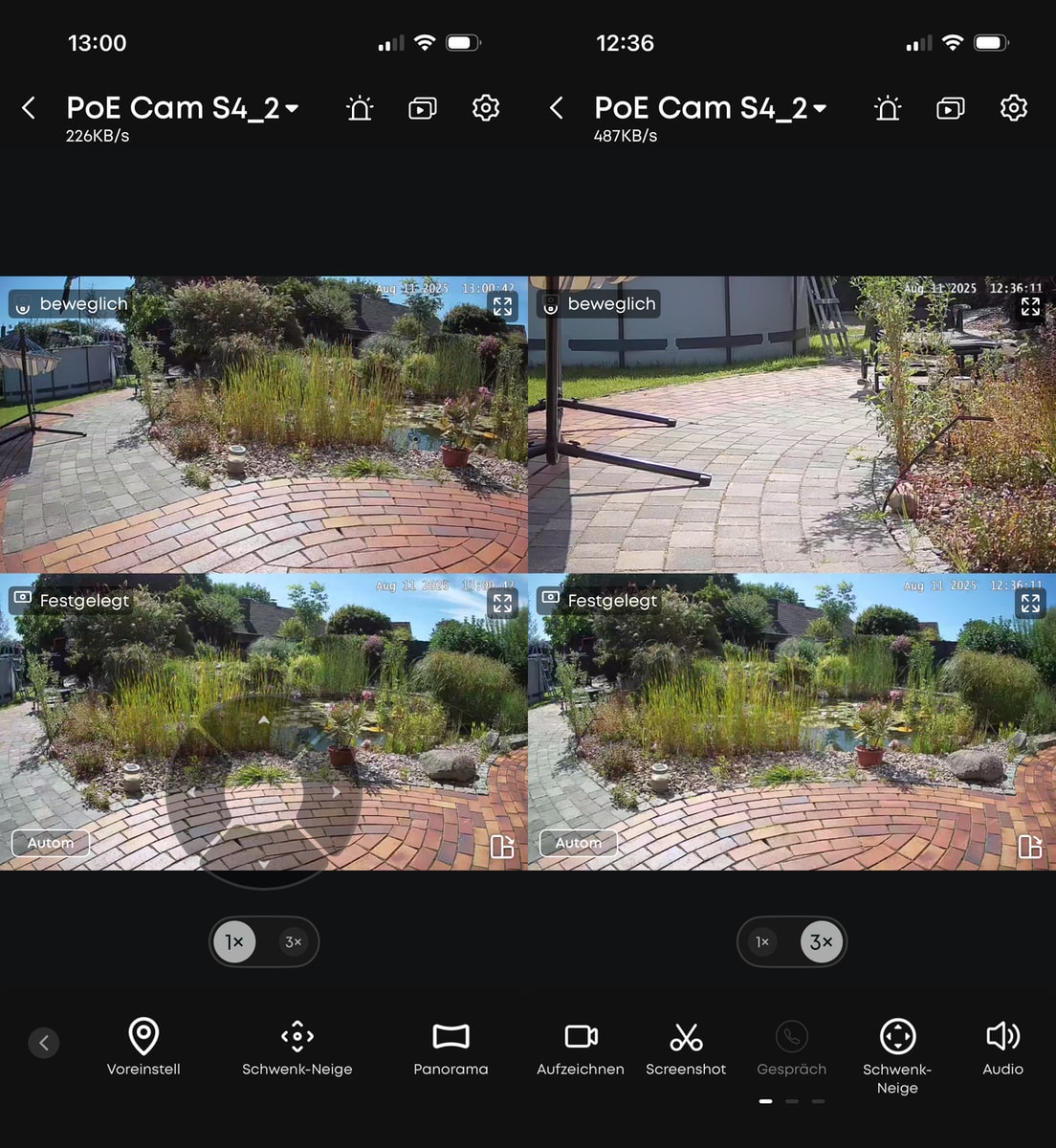 Jede Kamera verfügt über drei Objektive: Eine fest montierte 4K-Weitwinkelkamera mit 122-Grad-Sichtfeld und darunter eine 2K-PTZ-Kamera mit 360-Grad-Schwenkbereich. Der 8-fache Hybridzoom setzt sich aus 3-fachem optischen und 5-fachem digitalem Zoom zusammen. Die obere Kamera lässt sich zusätzlich neigen und in der Ausrichtung zur unteren Kamera verdrehen. Ganz schräg: In der App kann man da nix neigen oder so, man muss die obere Cam händisch justieren. Was ein Quatsch.