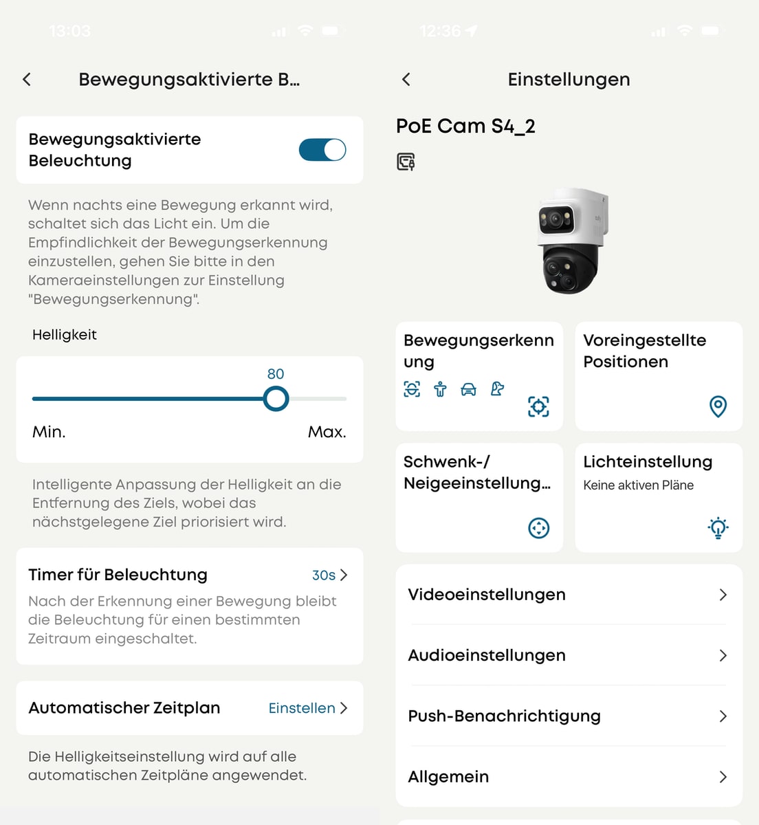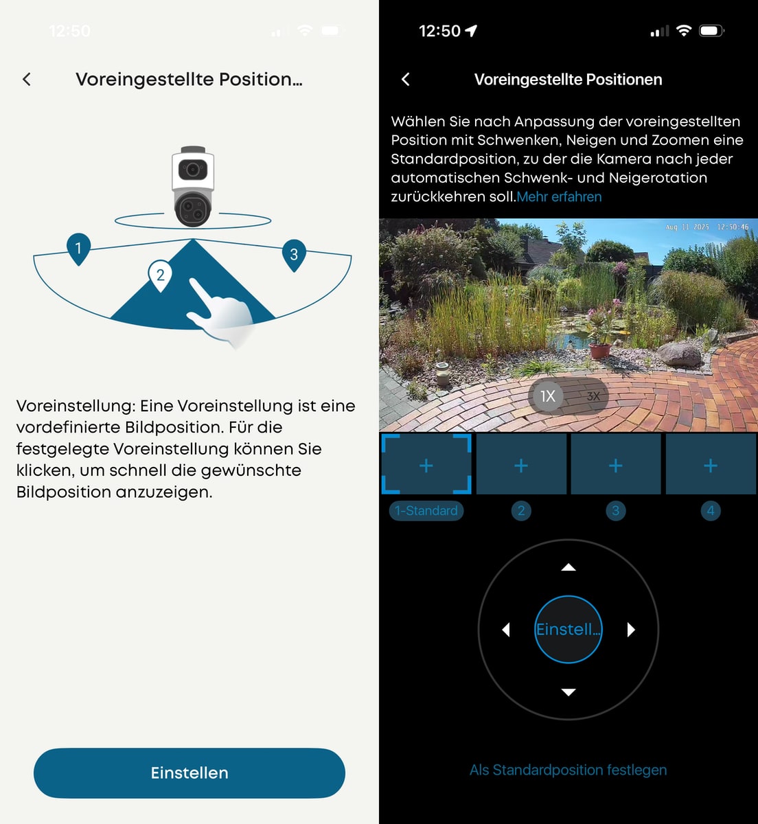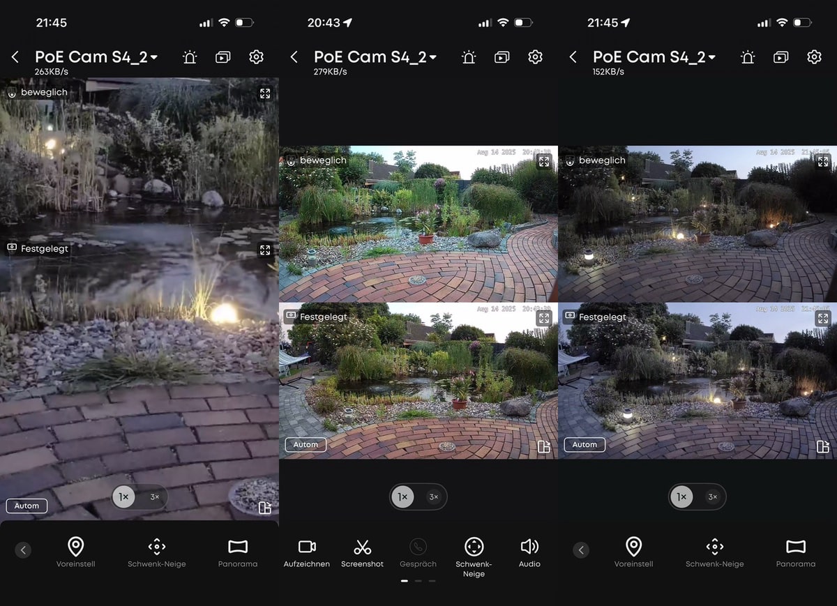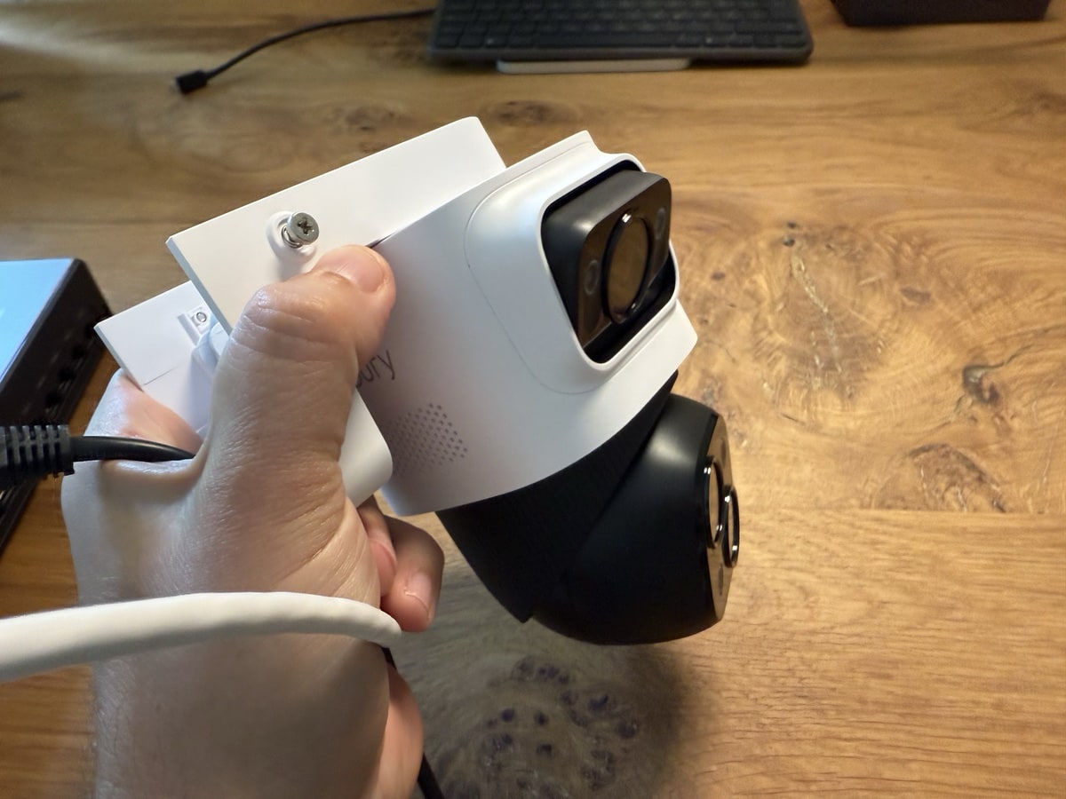 Jede Kamera verfügt über drei Objektive: Eine fest montierte 4K-Weitwinkelkamera mit 122-Grad-Sichtfeld und darunter eine 2K-PTZ-Kamera mit 360-Grad-Schwenkbereich. Der 8-fache Hybridzoom setzt sich aus 3-fachem optischen und 5-fachem digitalem Zoom zusammen. Die obere Kamera lässt sich zusätzlich neigen und in der Ausrichtung zur unteren Kamera verdrehen. Ganz schräg: In der App kann man da nix neigen oder so, man muss die obere Cam händisch justieren. Was ein Quatsch.