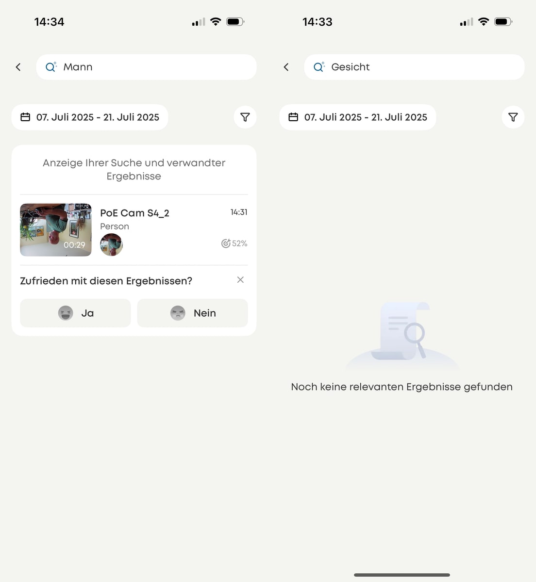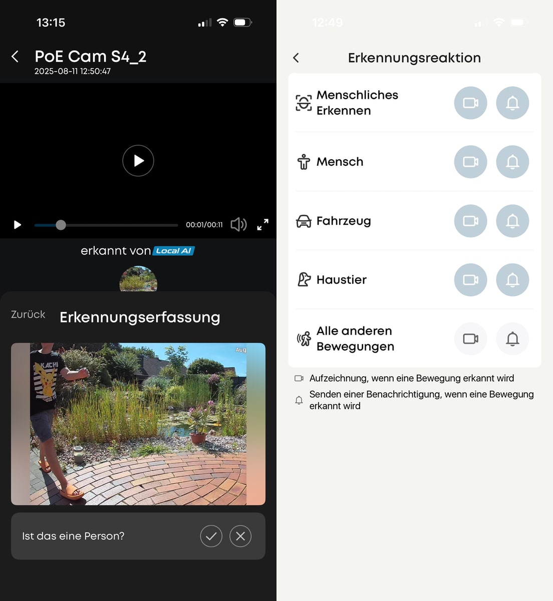 Die KI-Funktionen des Systems erkennen Menschen, Fahrzeuge und Haustiere. Eine Suchfunktion findet Aufnahmen anhand von Stichworten wie Objekten. Klappte ab und an. Die Erkennung arbeitet zuverlässig, auch wenn gelegentlich noch Schatten als Menschen oder größere Wildtiere als Haustiere interpretiert werden.