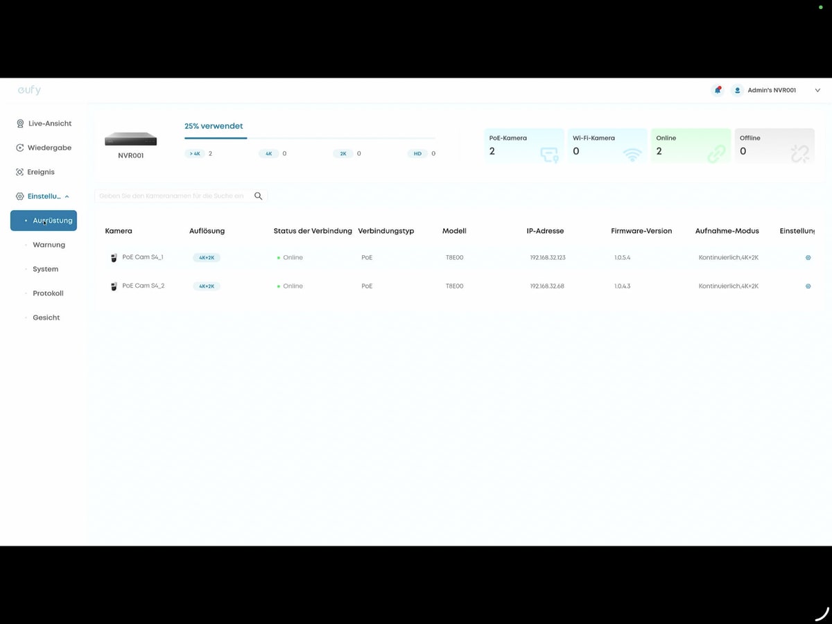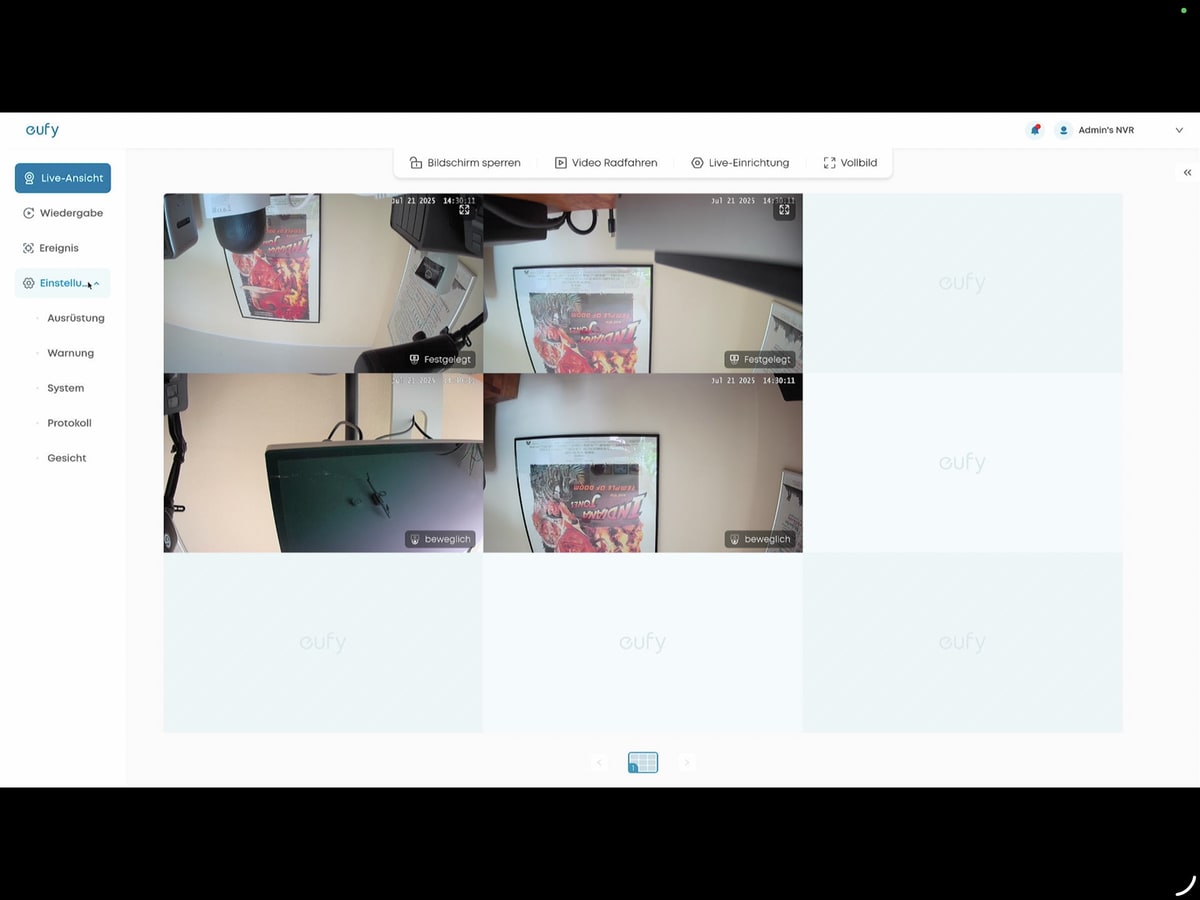 Für die Bedienung stehen theoretisch drei Wege zur Verfügung: die direkte HDMI-Verbindung zu einem Monitor mit der mitgelieferten Maus, eine Weboberfläche und die Smartphone-App. Die Browser-Lösung bei Eufy erfordert regelmäßige Neuanmeldungen und überträgt die Videodaten über das Internet, was nicht optimal ist. Und: Zum Zeitpunkt des Tests tauchten alle Kameras von Eufy in der Web-App auf, nicht allerdings die des NVR. Hier einmal Screenshots aus dem NVR, während der Einrichtung:
