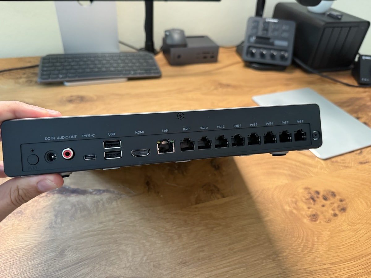 Die Basis bildet ein NVR im Set-Top-Box-Format mit Aluminiumgehäuse. Die integrierte 2-TB-Festplatte zeichnet auf Wunsch die Bilder aller Kameras rund um die Uhr auf. An der Rückseite befinden sich acht PoE-Anschlüsse für die Kameras, HDMI, zwei USB-A Ports, ein USB-C Port und ein Audio-Ausgang. Die Power-over-Ethernet-Technologie ermöglicht den Betrieb der Kameras mit nur einem Kabel für Strom und Daten.