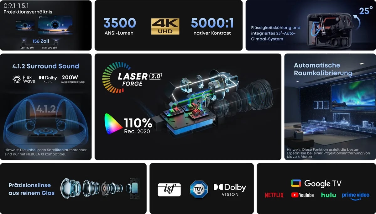Anker erweiterte Anfang Mai sein Nebula-Portfolio um ein Premium-Gerät. Der Nebula X1 kam mit Laser-Technologie und einigen nennenswerten technischen Eigenschaften auf den Markt. Das Herzstück bildet die 4K-Projektion mit Dolby Vision (Pixelshifting), die eine Bilddiagonale von bis zu 200 Zoll (508 Zentimeter) erreicht.
