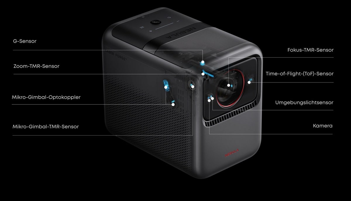 Der Nebula X1 ermöglicht es, durch seinen optischen Zoom ein Bild von bis zu 200 Zoll Größe zu werfen. Eine Besonderheit ist der oben erwähnte, eingebaute Gimbal, der sich um bis zu 25 Grad neigen lässt, was die Justierung an verschiedene Oberflächen vereinfacht (noch einfacher wird es sicher mit dem optionalen Gimbal-Ständer). Zu den automatisch regulierten Funktionen gehören die Trapezkorrektur, der Fokus mit einem 1,67-fachen optischen Zoom und die Anpassung an das Umgebungslicht. All diese Anpassungen lassen sich bequem mit nur einem Knopfdruck auf der Fernbedienung vornehmen, was den Projektor aus meiner Sicht besonders benutzerfreundlich macht.