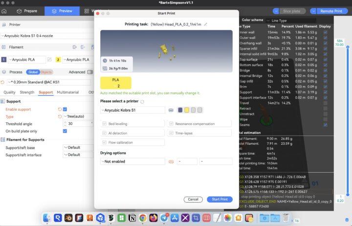 Anycubic liefert den hauseigenen „Anycubic Slicer Next“ mit. Dieser basiert, wie viele andere Slicer heutzutage, auf dem Fundament von PrusaSlicer bzw. dessen Fork OrcaSlicer. Die Oberfläche wirkt modern, und die grundlegenden Funktionen sind vorhanden. Genau dafür reicht jener Slicer nach meinem Empfinden aber auch nur, ich nutze weiterhin lieber den Orca Slicer – allein schon aufgrund seines Funktionsumfangs und der reinen Gewohnheit. Auf dem Drucker selbst läuft „Kobra OS“, das auf Marlin basieren soll. Wer Wert auf ein Live-Bild aus dem Inneren während des Drucks legt, bekommt hier ein doch vernünftiges Bild geliefert, das nicht nur live, sondern auch gut ausgeleuchtet dargestellt wird – auch in der mobilen App.