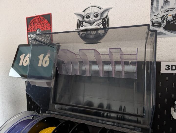 Kommen wir zum spannendsten Teil des Kobra S1 Combo: der ACE Pro Einheit (Anycubic Color Engine Pro). Sie ist mehr als nur ein einfacher Materialwechsler. Standardmäßig nimmt sie vier Filamentrollen auf, lässt sich aber durch den Anschluss einer zweiten ACE Pro Einheit auf acht Farben erweitern. Alleinstellungsmerkmal hier ist die integrierte aktive Trocknungsfunktion. Das Gerät verfügt über ein Heizsystem mit bis zu 200 Watt Leistung und einen Lüfter, um die eingelegten Filamentspulen aktiv bei bis zu 55 °C zu trocknen. Das funktioniert nicht nur als separater Trocknungsvorgang, sondern auch während des Druckens. Anycubic liefert sogar voreingestellte Trocknungsprofile für verschiedene Filamenttypen mit.
