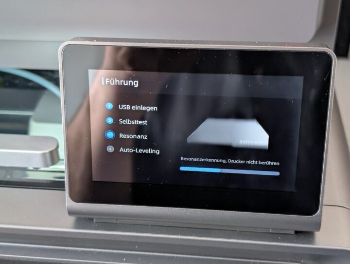 Nach dem Einschalten begrüßt einen der 4.3 Zoll große Touchscreen, der sich auch neigen lässt. Die erste Inbetriebnahme beinhaltet die automatische Kalibrierung. Der Drucker fährt sein Programm ab: Auto-Leveling mit dem LevIQ 3.0 System (arbeitet mit gerade einmal 25 Messpunkten – etwas wenig meiner Meinung nach), Z-Offset-Einstellung und die wichtige Resonanzkompensation für hohe Geschwindigkeiten. Dauert dann rund 10 Minuten. WLAN anmelden, kostenlose App optional installieren und das Gerät verknüpfen – alles Handgriffe, die man bereits von anderen Modellen kennt und auch abseits der 3D-Druck-Welt erledigt.