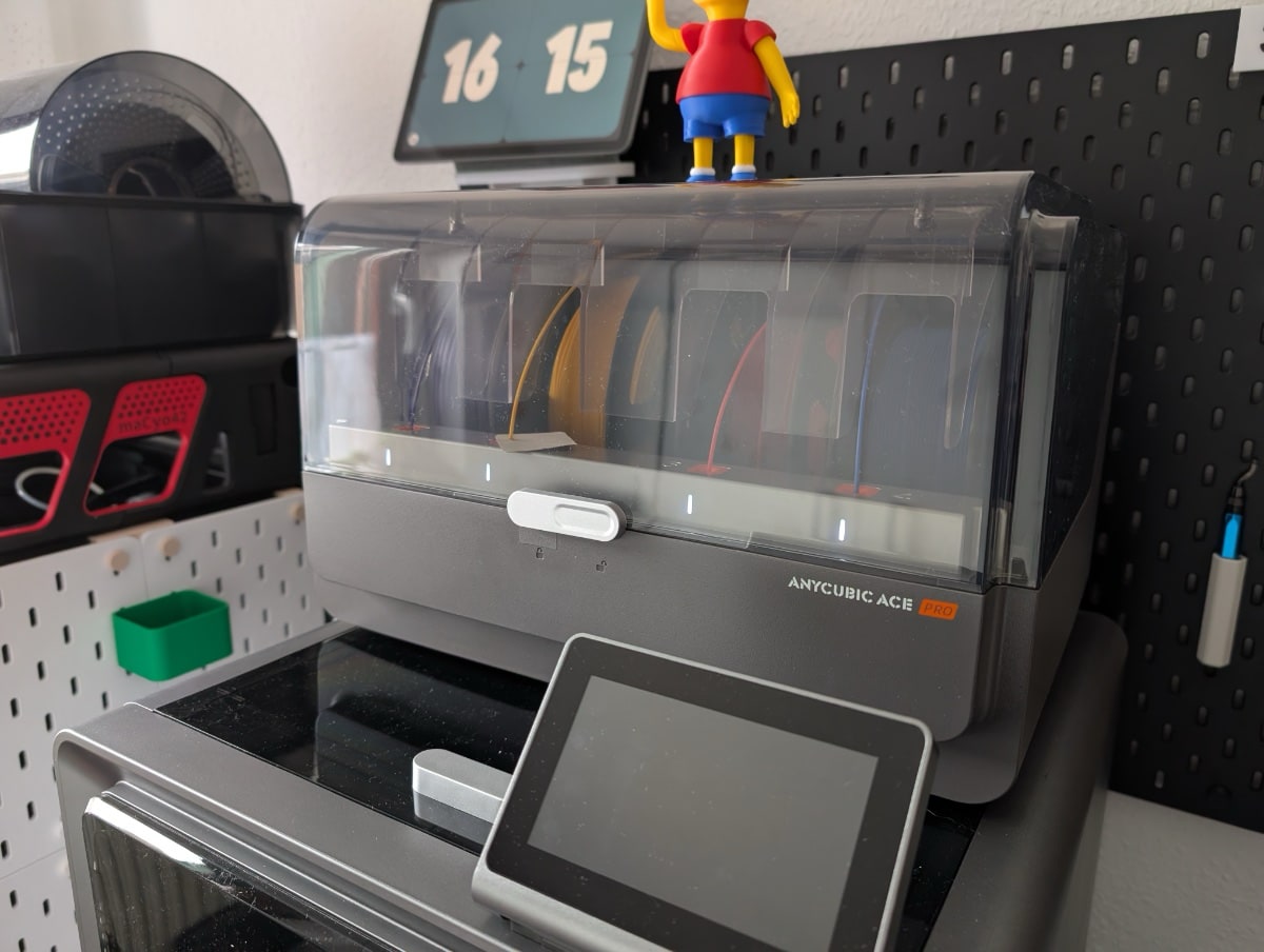 Anycubic wirbt mit einem Start in 15 Minuten. Nun ja, das ist sportlich. Realistisch betrachtet dauert es vielleicht einen Tick länger, aber der Aufbau ist tatsächlich keine Raketenwissenschaft. Hab das gemeinsam mit Sohnemann erledigt, dessen filigrane Hände passen hervorragend, um die kleinen Sicherungsschrauben an Druckbett und Co. zu lösen. Die Hauptarbeit besteht nämlich darin, die Transportsicherungen zu entfernen. Dann wird die ACE Pro Einheit oben auf den Drucker gesetzt. Kabel verbinden (Strom für die ACE Pro, Datenkabel zum Drucker) und die vier PTFE-Schläuche vom ACE Pro zum Filament-Puffer auf der Rückseite des Druckers führen und anschließen.
