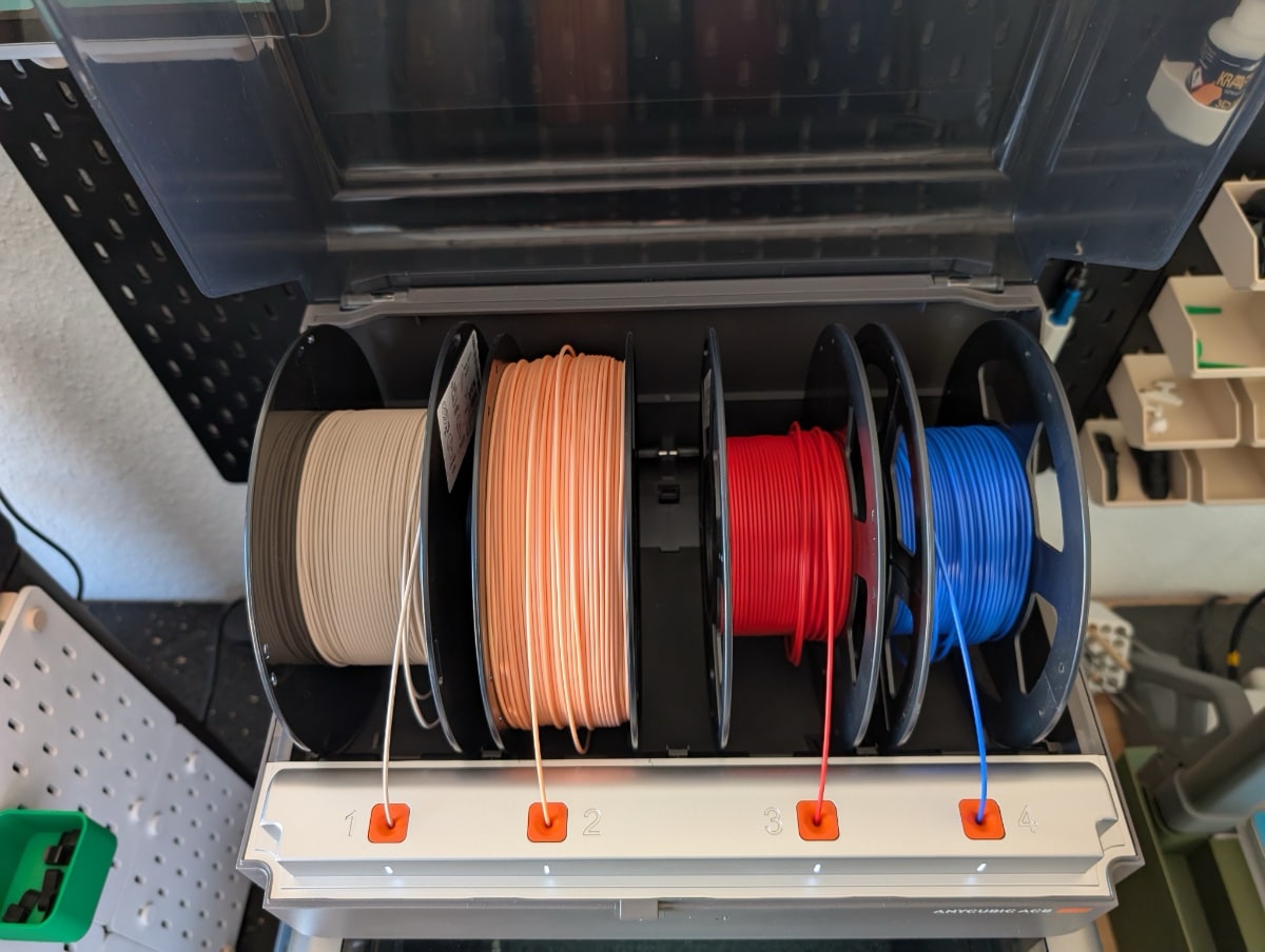 Die ACE Pro verfügt über eine RFID-Erkennung, um Filamenttyp und -farbe automatisch zu erkennen. Das funktioniert zuverlässig mit Anycubic-eigenem Filament, angeblich sollen hier auch andere Hersteller funktionieren (u.a. eSun). Mit dem automatischen Filamenteinzug des ACE Pro bin ich noch nicht so ganz zufrieden. In unregelmäßigen Abständen erhalte ich beim Start eines neuen Drucks die Meldung, dass der Einzug des neuen Filaments nicht möglich ist. Schaut man dann nach, ist schnell zu erkennen, dass das vorher genutzte Filament auch noch gar nicht vernünftig aus dem Endstück des PTFE-Tubes gezogen wurde und somit auch gar kein Platz für neues Filament da ist. Dann hilft allerdings auch “schnell”, wenn man über die App oder den Slicer den Filamentauswurf noch einmal ansteuert, anschließend kann der neue Druck weitergehen.