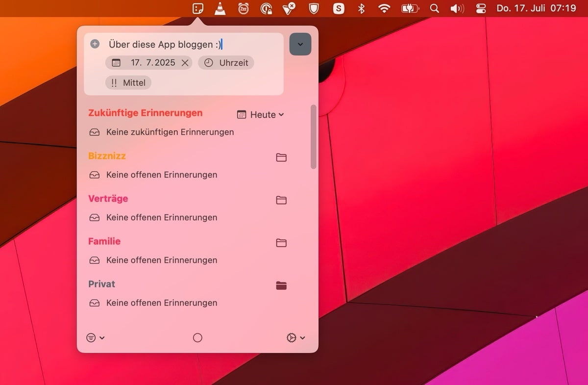 Die Funktionalität des Tools konzentriert sich auf die wesentlichen Aspekte der Aufgabenverwaltung. Erweiterte Funktionen wie das Setzen von Ortsmarkierungen sind nicht implementiert, dafür muss man weiterhin die reguläre Erinnerungen-App nutzen. Solltet ihr bereits von der App gelesen haben, ist das gut möglich, dass es hier passierte, ich wies bereits 2021 und 2024 auf sie hin. Allerdings kann man sie vielleicht noch einmal auf die Bühne stellen, da neulich ein Update auf Version 1.25.0 veröffentlicht wurde.