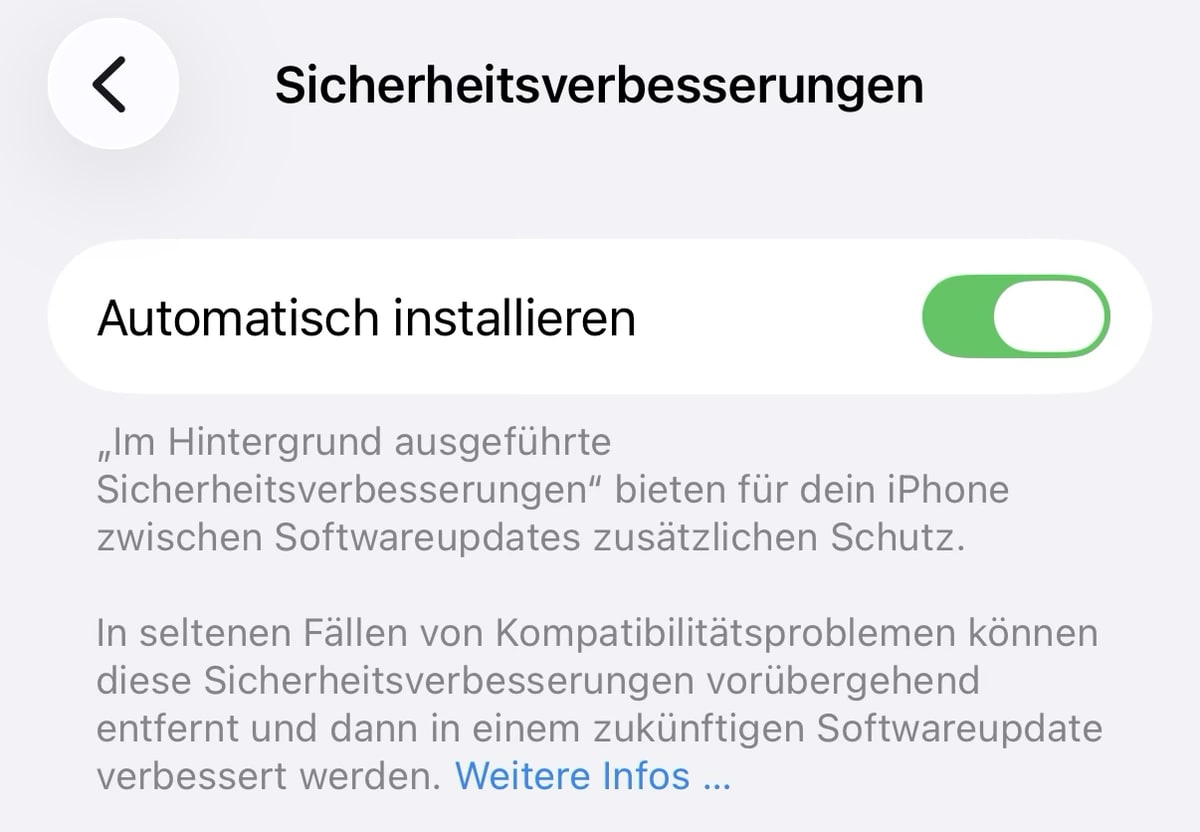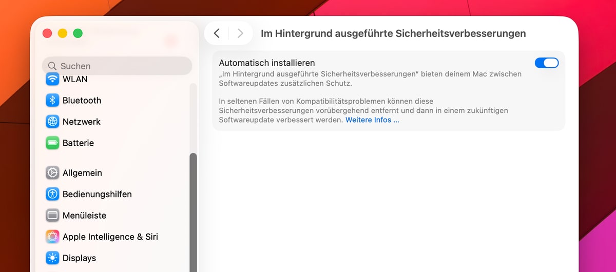 Der Unterschied zu regulären Updates: Diese Hintergrund-Patches laufen zwischen den normalen Updates durch, werden automatisch installiert und erfordern keinen Neustart. Apple verspricht damit eine schnellere Reaktionszeit bei Sicherheitslücken, ohne dass man auf das nächste große Update warten muss. Die neuen Sicherheitsverbesserungen werden bei Bedarf für macOS 26.1, iOS 26.1, iPadOS 26.1 und spätere Versionen ausgerollt. Unter macOS 26.1 lässt sich die Funktion in den Systemeinstellungen unter Datenschutz & Sicherheit aktivieren, wo man die automatische Installation der Hintergrund-Sicherheitsverbesserungen einschalten kann.