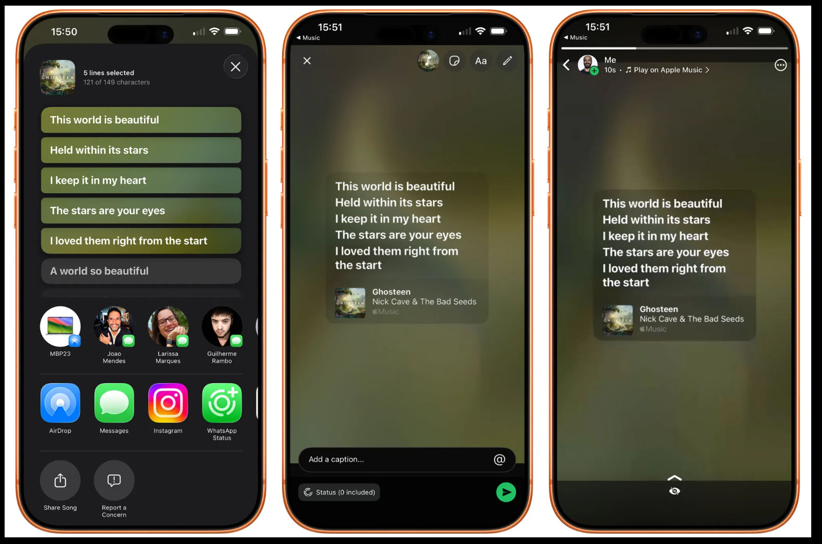Entwickler können mit dieser Funktion nämlich schon ab iOS 26.2 in der Beta 1 experimentieren. Wichtig: Es geht hier nicht darum, dass ihr direkt Musik von Apple Music als Untermalung für euren WhatsApp Status nutzen könntet. Vielmehr werdet ihr die Chance haben, sozusagen die Musik, die ihr gerade hört, in Form einer Weiterleitung und eines Textauszugs zu teilen. Dafür soll es dann auch anpassbare Layouts geben. Obendrein werdet ihr etwa bestimmte Textzeilen auswählen und so hervorheben können.