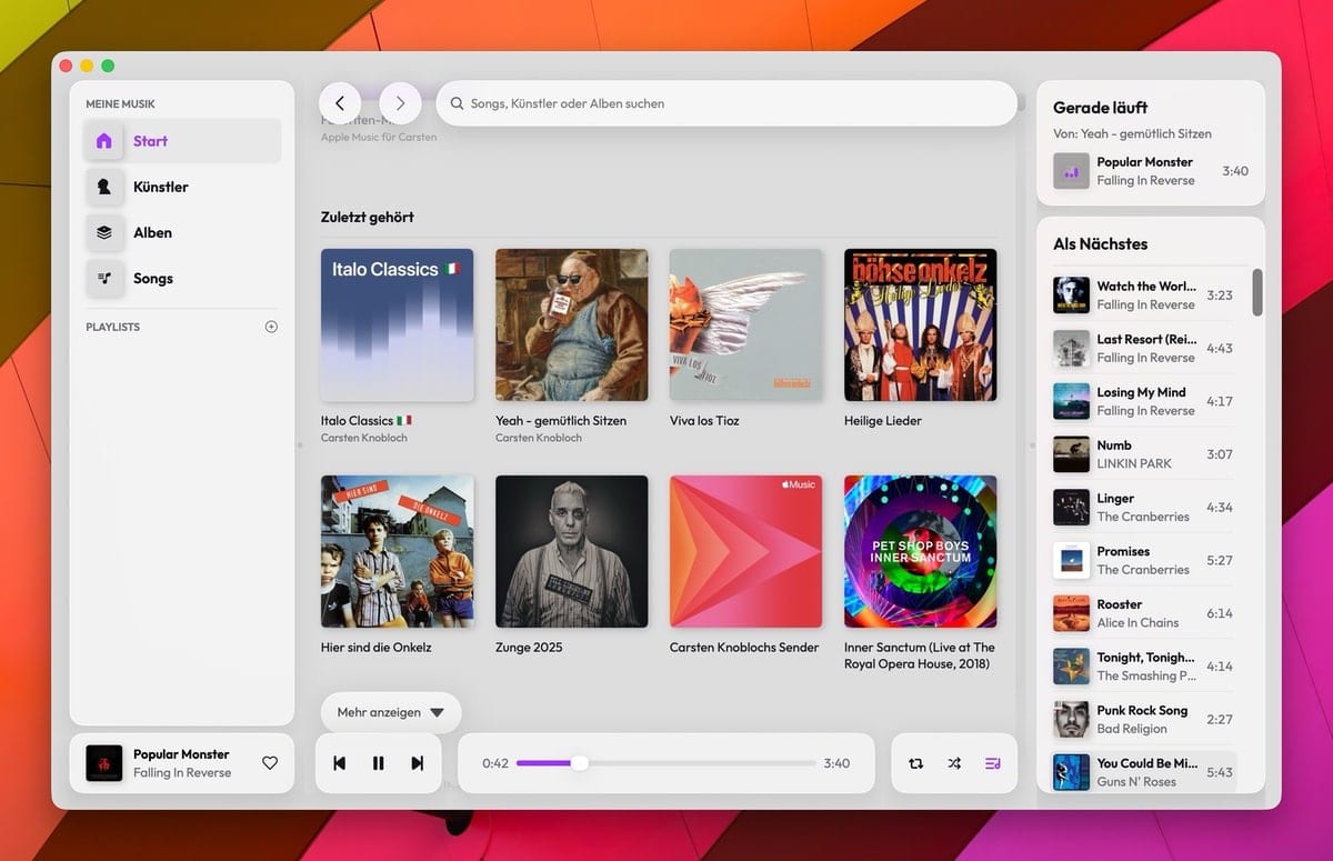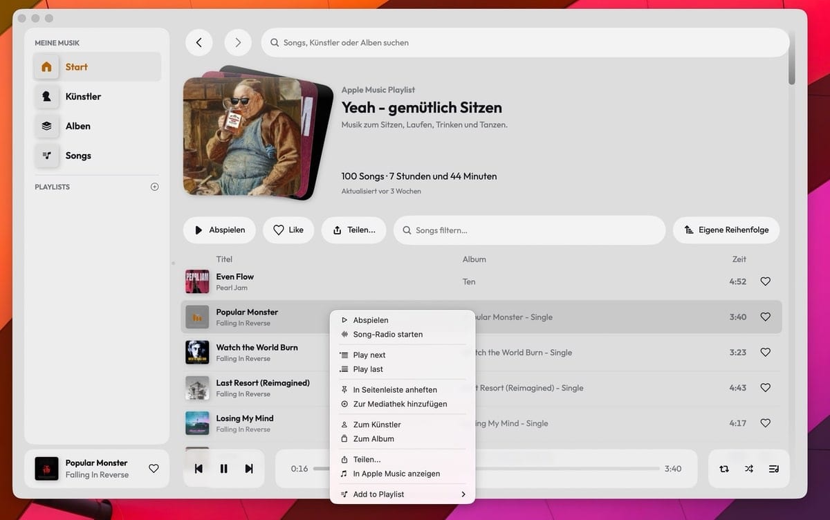 Wer seine Apple-Music-Bibliothek nutzt, findet sich sofort zurecht. Playlisten, Favoriten und die komplette Mediathek stehen nach einem Import zur Verfügung – alles an gewohnter Stelle. Mit an Bord ist auch Apple Intelligence, so werden Playlist-Beschreibungen eben durch KI generiert. Ebenso ist der Support für last.fm an Bord.