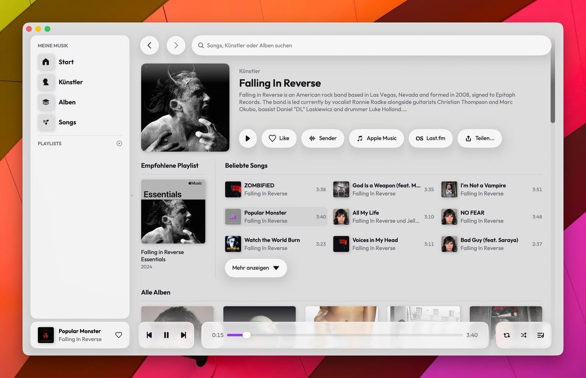 Eine neue App für Apple Music macht gerade die Runde. Unser Leser Dennis hat uns auf seine App Daft Music hingewiesen. Die möchte den Musikstreamingdienst von Apple in einem neuen Gewand präsentieren und verspricht dabei eine bessere Performance als die hauseigene Musik-App. Die für macOS entwickelte Anwendung befindet sich aktuell in der TestFlight-Phase. Was sofort auffällt: Der Entwickler hat sich bei der Gestaltung der Benutzeroberfläche viel Mühe gegeben. Das Interface wirkt aufgeräumt und fügt sich nahtlos in das Design von macOS ein.