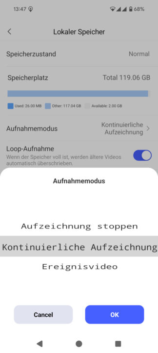 Aber um es zu testen, habe ich zunächst für einen Tag die SD-Karte zur Aufzeichnung genutzt und auf dauerhafte Aufzeichnung gestellt und was soll ich sagen: Da kommt nix. Die Karte gähnt vor Leere. Bei 128 GB ist da auch genügend Platz für ein paar Stunden Video in 2K-Qualität bei nur 1,4 MBit/s.
