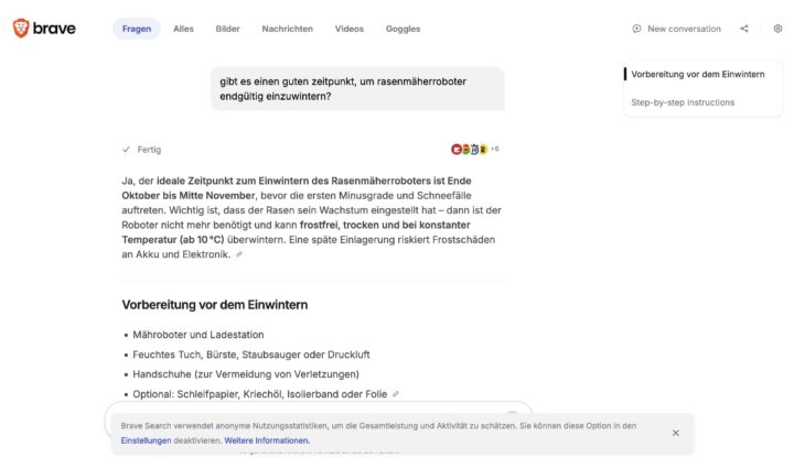 Technisch basiert das Ganze auf dem bereits seit März 2023 eingesetzten „Summarizer“ und greift auf den hauseigenen Suchindex zurück, der laut Brave über 35 Milliarden Webseiten umfasst. Ein entscheidender Punkt dabei ist, dass die Antworten der KI stets auf den Inhalten der Websuche basieren. Die KI greift dabei ausschließlich auf die für die Anfrage relevanten Suchergebnisse zurück, was die Wahrscheinlichkeit von frei erfundenen oder fehlerhaften Informationen reduzieren soll.