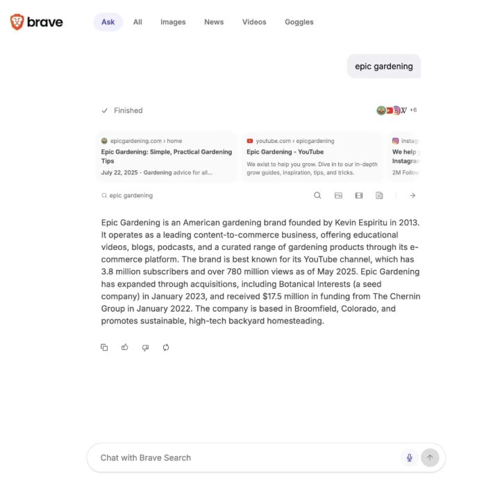 Anstatt zwischen einer klassischen Suchergebnisseite und einem separaten KI-Chat wechseln zu müssen, kombiniert Ask Brave beides in einer einzigen Oberfläche. Ihr erhaltet eine von der KI generierte, zusammenfassende Antwort auf eure Anfragen und seht gleichzeitig die gewohnten Suchergebnisse wie Webseiten, Bilder oder Videos.