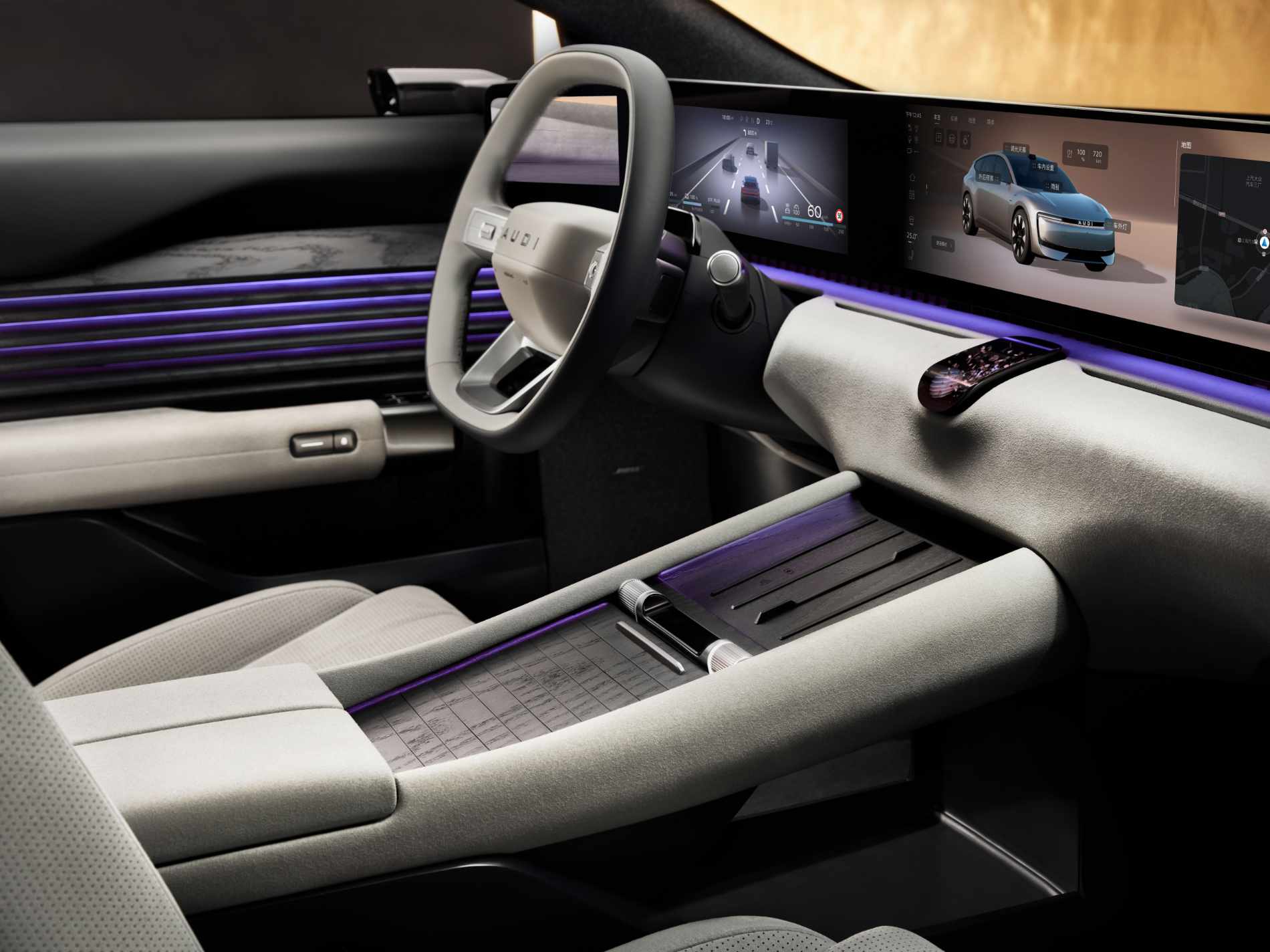 Laut Audi habe man durch die Zusammenarbeit mit SAIC die Entwicklungszeit des ersten Serienfahrzeugs um 30 Prozent verkürzen können. Besonders spannend ist das Interieur, denn man setzt etwa auf einen Duftdiffusor, der drei Aromen abgeben kann. Die Mittelkonsole bietet Stauraum für zwei Smartphones, die dort auch kabellos laden können – dank aktiver Kühlung mit bis zu 50 Watt. Die Sitze sind mit Lautsprechern in den Kopfstützen ausgestattet. Das Panoramaglasdach hingegen verdunkelt sich automatisch.