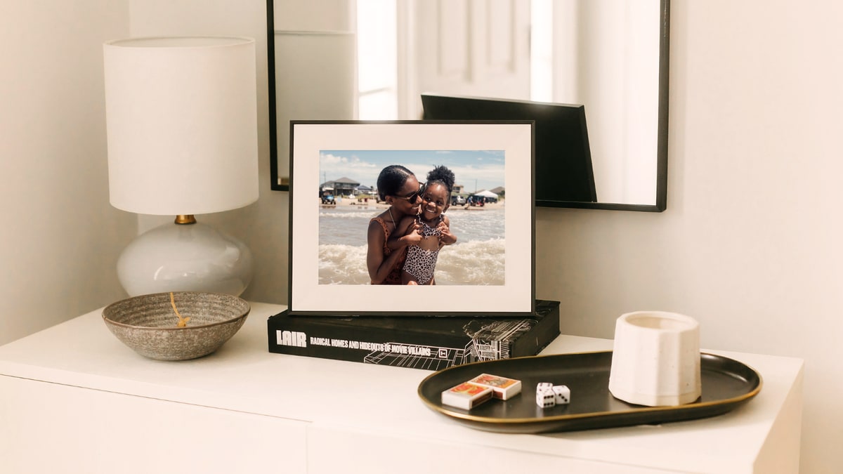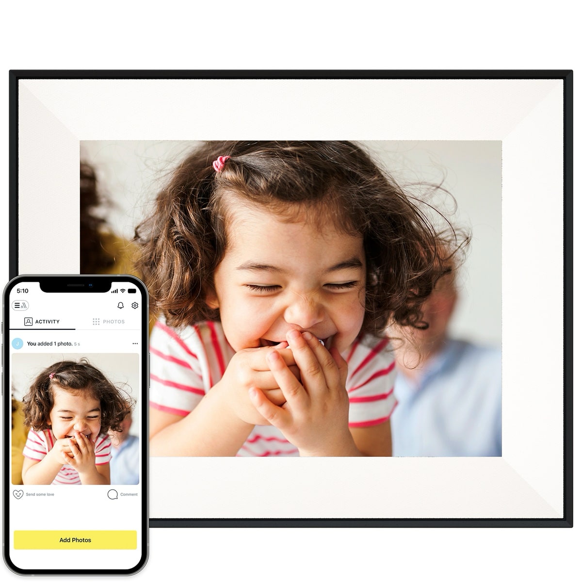 Am unteren Bildrand befindet sich eine dezente Touch-Leiste, um durch Fotos und Videos durchzublättern. Bilder werden per App aufgespielt, der Bilderrahmen selbst verfügt über eine WLAN-Verbindung. Fotos können beispielsweise von Google Fotos oder der iCloud direkt importiert werden. Außerdem lässt sich der Rahmen auch vor dem Verschenken schon mit persönlichen Fotos oder Videos befüllen. Hierzu befindet sich ein QR-Code auf der Rückseite der Box. Es lassen sich mehrere Nutzer, respektive Familienmitglieder, einladen, den Bilderrahmen von weltweit mit Inhalten zu bespielen. Der Cloud-Speicher ist, so der Hersteller, hierbei unbegrenzt.