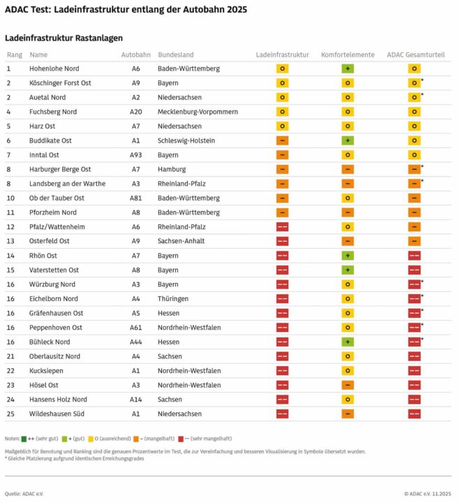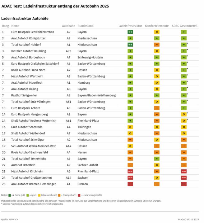 13 haben immerhin das Urteil „gut“ erhalten – ein „sehr gut“ konnte der ADAC allerdings gar nicht vergeben. Dabei haben Autohöfe im Gesamtbild etwas besser abgeschnitten als die Rastanlagen. Zu den überprüften Kriterien zählten nach eigenen Angaben die Anzahl der Ladesäulen bzw. -punkte, deren Ladeleistung, die generelle Funktionstüchtigkeit sowie Bezahlmöglichkeiten und Kostentransparenz. Geringfügiger ließ man auch den Komfort einfließen. Damit sind Rahmenbedingungen wie eine Überdachung, Gastronomie und Sanitäranlagen gemeint.