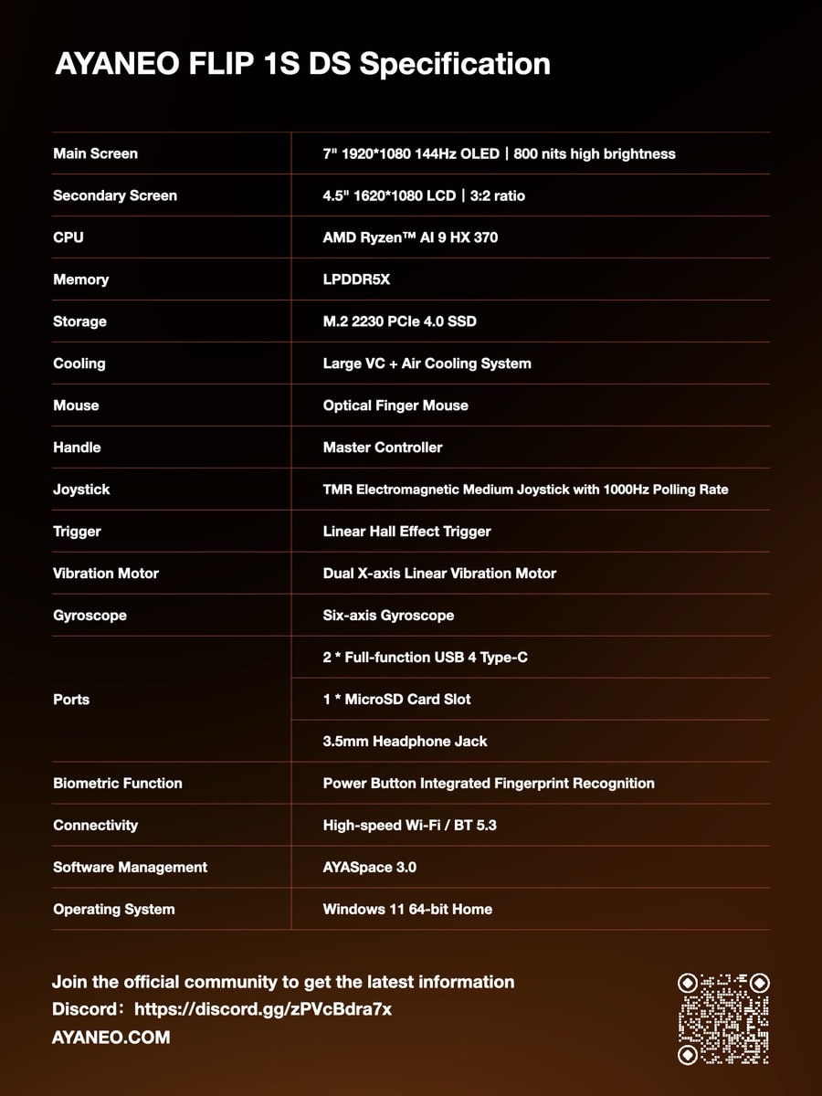 Ayaneo präsentiert mit dem Flip 1S DS die nächste Generation seines Gaming-Handhelds. Die Weiterentwicklung des im Mai 2024 erschienenen Flip DS wartet nicht überraschend mit technischen Verbesserungen auf. Das Hauptdisplay wurde auf ein 7-Zoll-OLED-Panel (17,78 cm) aufgewertet, das nun mit 144 Hz Bildwiederholrate und einer Spitzenhelligkeit von 800 cd/m² punktet. Auch das zweite Display wurde überarbeitet und misst jetzt 4,5 Zoll (11,43 cm) bei einer Auflösung von 1620 x 1080 Pixeln.