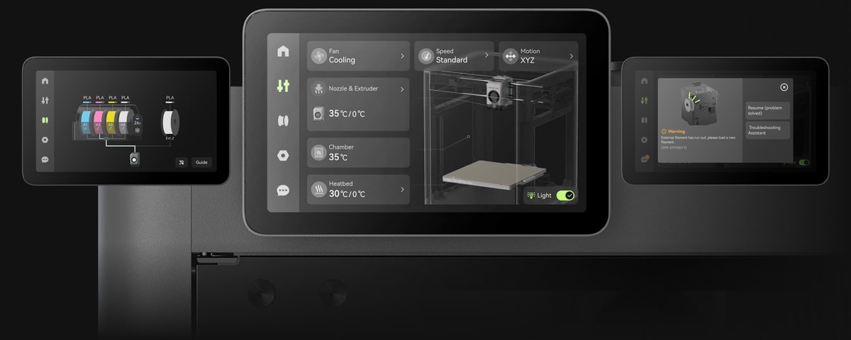Das Gehäuse beherbergt einen 5-Zoll-Touchscreen mit überarbeiteter Benutzeroberfläche. Die neue Generation des PMSM-Servo-Extruders liefert jetzt eine um 70 Prozent höhere Extrusionskraft von 8,5 kg, so das Unternehmen.