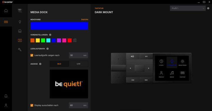 be quiet! bewirbt die Dark Mount mit einer dreifachen Schicht im Inneren, welche für leise Anschläge sorgen soll. Dabei gestaltet man seine erste Gaming-Tastatur modular. Das heißt in diesem Fall, dass ihr das Numpad und das sogenannte Media Dock auch versetzen bzw. abnehmen könnt. Rechts oben sitzen zudem acht anpassbare Display-Tasten. Für die weiterführenden Einstellungen benötigt ihr die App be quiet! IO Center. Diese gibt es aktuell nur für Windows. Wer unter macOS mit der Tastatur hantieren möchte, ist aber nicht komplett aufgeschmissen. So gibt es auch eine Weboberfläche, die sich dann eben auch an Apple-Geräten nutzen lässt. Allerdings findet ihr den vollständigen Funktionsumfang nur in der Windows-App.