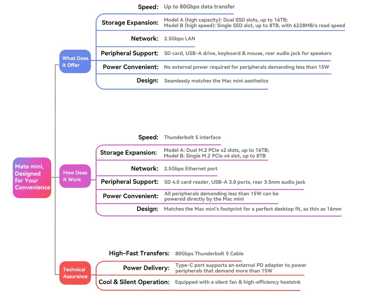Die Anschlussvielfalt umfasst einen 2,5-Gigabit-Ethernet-Port, einen SD-4.0-Kartenleser, USB-A-3.0-Ports und einen Audio-Ausgang. Das Dock wird direkt über den Mac mini mit Strom versorgt, sofern die angeschlossenen Peripheriegeräte nicht mehr als 15 Watt benötigen. Für leistungshungrigere Geräte steht ein zusätzlicher USB-C-Port mit Power Delivery zur Verfügung. Die Kühlung erfolgt über einen integrierten, geräuscharmen Lüfter und 360-Grad-Belüftungsöffnungen, was auch bei längerer Nutzung stabile Betriebstemperaturen gewährleisten soll. Das Dock unterstützt M.2-2280-SSDs mit PCIe 3.0, 4.0 und 5.0.