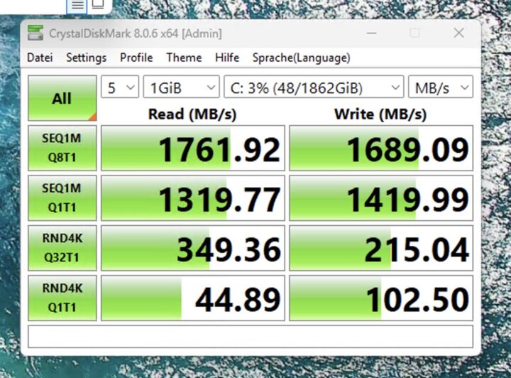 Im Test mit TrueNAS Community lagen die sequentiellen Lese-/Schreibraten der Gen 3 x1-Slots bei rund 750/550 MB/s, der Gen 3 x2-Slot schaffte 1,2 GB/s lesend und knapp 1 GB/s schreibend. Wie ihr im CrystalDiskMark seht, ist aber auch mehr drin. Das reicht für die meisten Heimanwendungen völlig aus, auch wenn Power-User mit vielen parallelen Zugriffen an die Bandbreitengrenzen stoßen werden.