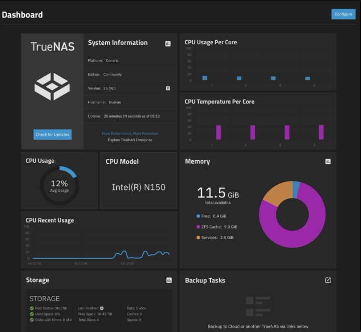 Im Herzen arbeitet ein Intel Twin Lake N150 (4 Kerne, 4 Threads, bis 3,6 GHz, 6 W TDP), kombiniert mit 12 GB LPDDR5-RAM. Der RAM ist leider fest verlötet und kann nicht erweitert werden. Für typische NAS-Aufgaben wie Medienstreaming (Plex, Jellyfin), Backups, Apps wie Pi-hole oder Soft-Routing reicht das locker. Auch 4K-Streams sind kein Problem. Das aber nur, solange kein Hardware-Transcoding nötig ist.
