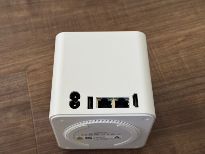 Trotz der kompakten Maße bietet das ME Mini alles, was man benötigt. Zwei 2,5 GbE-LAN-Ports (mit Link Aggregation), Wi-Fi 6 (Intel AX101), Bluetooth 5.2, einen USB 2.0 (hinten), einen USB 3.2 Gen 2 (vorn), einen USB-C (10 Gbps, vorn) und HDMI 2.0 (4K/60Hz). Damit lässt sich das NAS nicht nur kabelgebunden, sondern auch kabellos ins Netzwerk einbinden. Dadurch ist der Einsatzort auch flexibel wählbar.