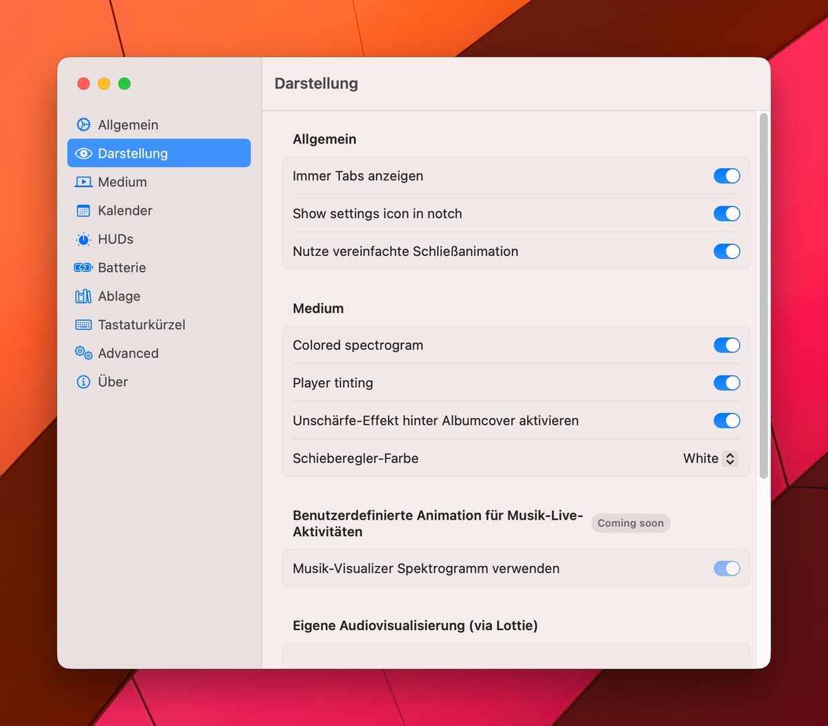 Parallel dazu ersetzt ein neues HUD die bisherigen Anzeigen komplett und hängt sich enger an macOS an. Sprich: Ihr habt auf Wunsch nicht mehr die Anzeige von macOS beim Steuern von Lautstärke, Bildschirmhelligkeit und so, stattdessen wird das in der Notch angezeigt. Funktionierte in meinem Test aber nur mit der Lautstärke.