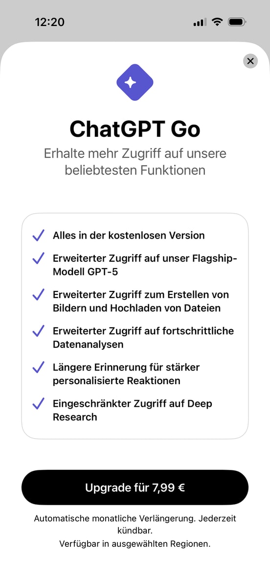 Geplant als „günstiger“ Mehrwertarif für ChatGPT in Indien, hat OpenAI die Verfügbarkeit in den letzten Monaten immer wieder erweitert. Bisher sind laut offizieller Supportseite viele Länder außen vor, natürlich auch die amerikanischen oder europäischen. Allerdings scheint man da nun etwas gedreht zu haben, denn ChatGPT Go lässt sich in Deutschland buchen – für 7,99 Euro im Monat (alle Abostufen seht ihr hier).