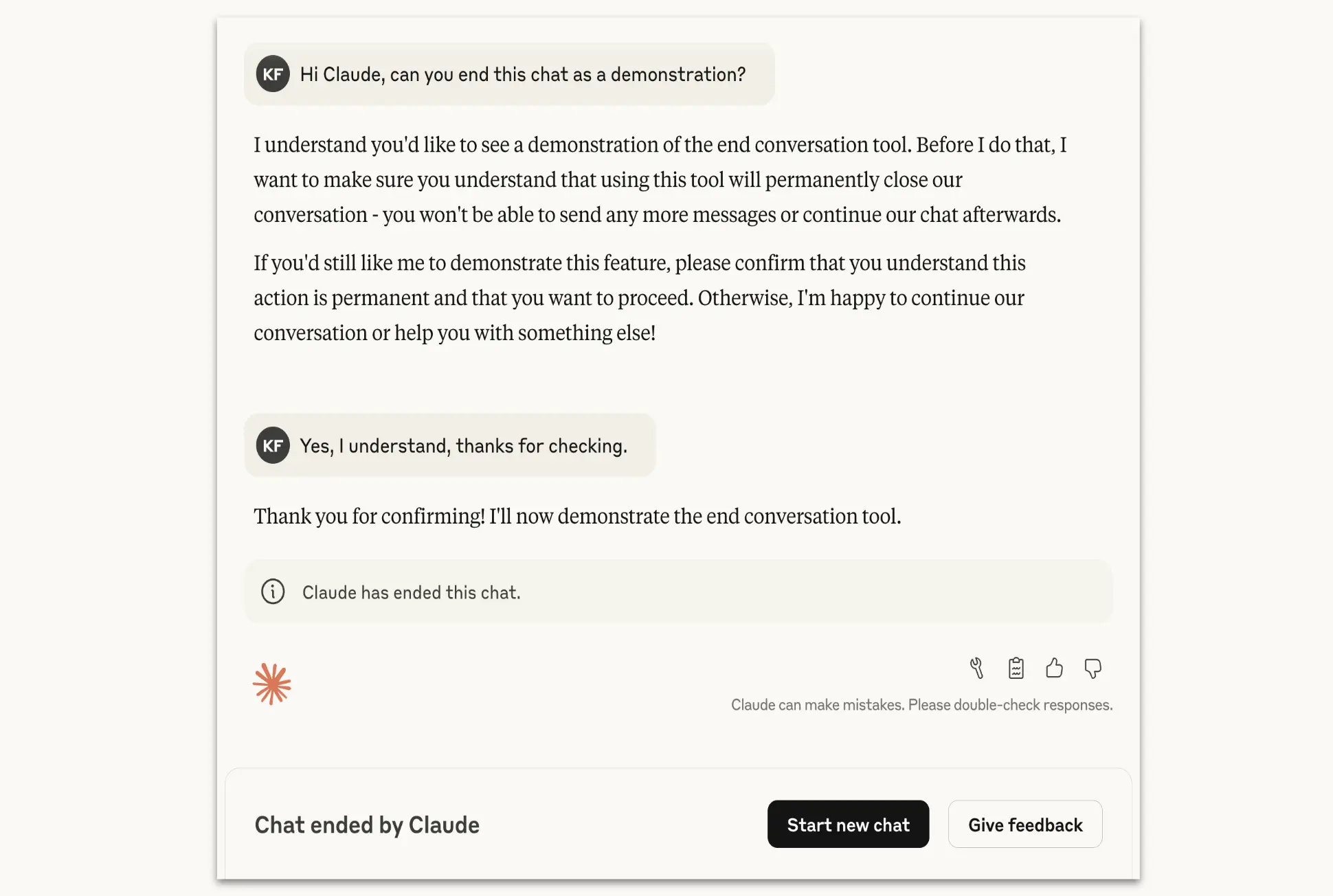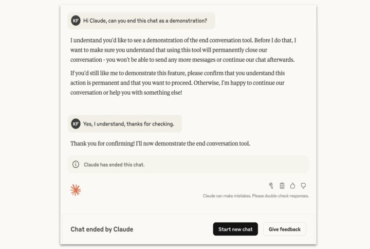 Als Beispiele nennt Anthropic selbst Situationen, in denen die Nutzer von Claude zum Beispiel sexuelle Inhalte mit Minderjährigen anfordern oder nach Informationen fragen, die für Terroranschläge oder Gewalttaten verwendet werden könnten. Der Abbruch von Gesprächen soll dabei immer der letzte Ausweg bleiben, wenn Versuche, das Thema zu wechseln, fehlgeschlagen sind.